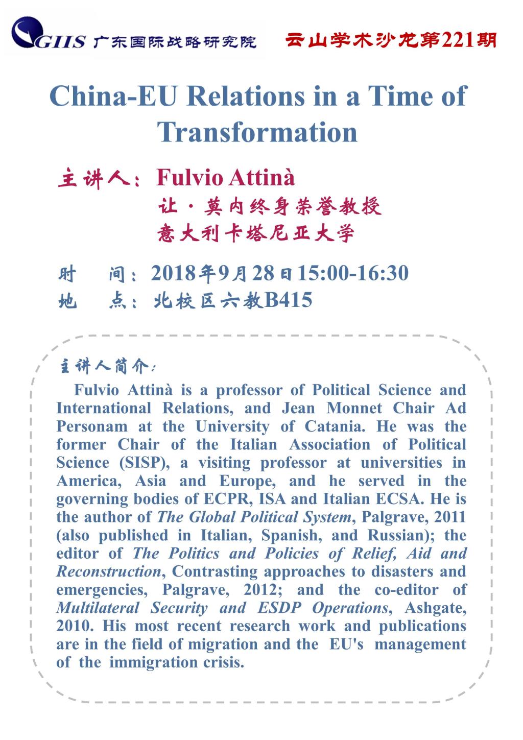 关于更改“云山学术沙龙第221期、欧洲论坛第64期:China-EU Relations in a Time of Transformation”讲座地点的通知