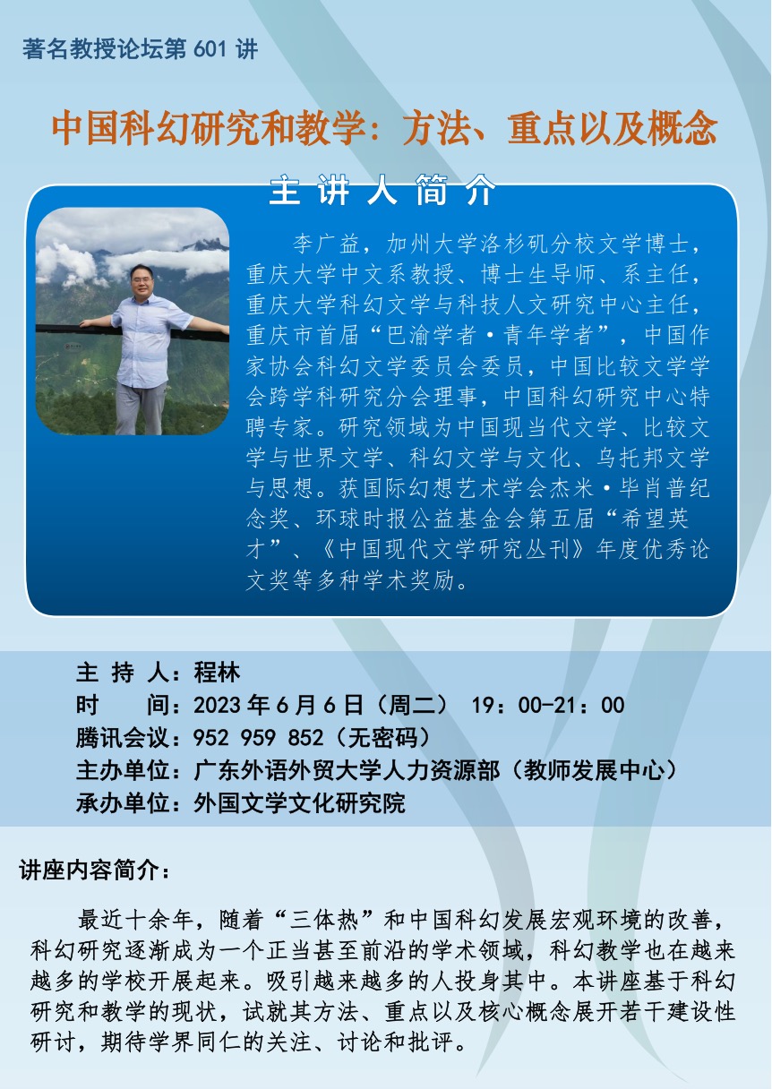 著名教授论坛第601讲:中国科幻研究和教学:方法、重点以及概念