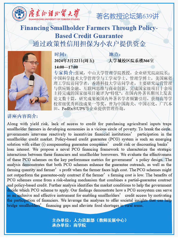 著名教授论坛第639讲:Financing Smallholder Farmers Through Policy-Based Credit Guarantee(通过政策性信贷担保为小农融资)