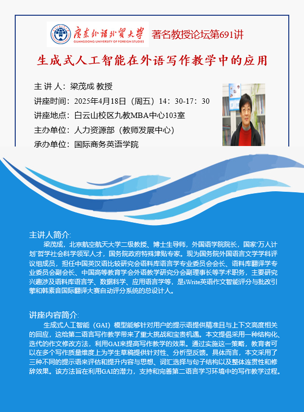 著名教授论坛第691讲:生成式人工智能在外语写作教学中的应用
