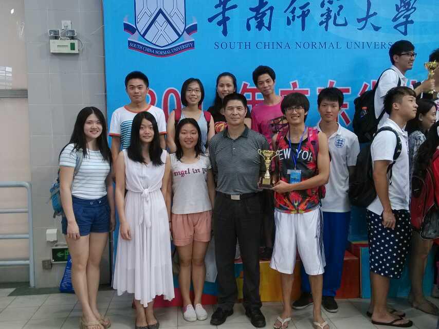 本网讯6月21日—22日,2014年广东省大学生游泳锦标赛在大学城华南师范大学游泳馆举行,beat365游泳队组织了16名运动健儿参加了甲组比赛,在两天的比赛中,beat365游泳队一共获得了2枚金牌,1枚银牌,1枚铜牌,并夺得了甲组团体第四名的好成绩。