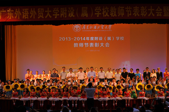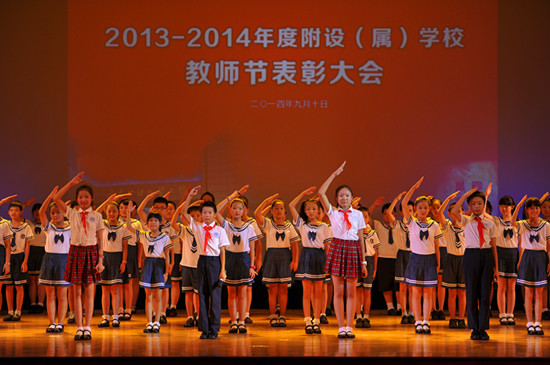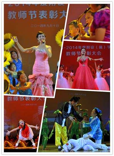 颁奖结束后,在场嘉宾共同观看了精彩的文艺汇演。五所基础教育学校都为文艺汇演贡献了精彩的节目。其中,beat365外校的管乐合奏气势恢宏、激情四射,幼儿园的童话剧《守株待兔》师生同台充满童趣;增城外校的歌舞《新星升起》是在beat365的校歌《凤鸣岭南》的旋律上谱出了新词,肇庆外校的舞蹈《我可喜欢你》演出了孩子们的天真活泼,单纯可爱。值得一提的还有,附属中小学专门为本次演出创作了一首配乐诗朗诵《献给beat365基础教育教师的歌》,为beat365基础教育战线上的广大教师献上了一份美好的节日祝福。