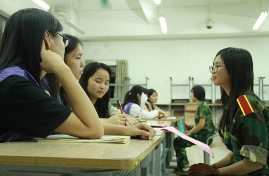 与去年来自广东武警学校的“学生教官”不同,今年的教官队伍全是来自正规部队、经过组织挑选的现役军人。在训练时,他们不苟言笑,严肃纠正每一个学生的细微动作。然而,休息期间他们也是风趣的“四方好男儿”,《团结就是力量》、《军中绿花》、《小苹果》都是必唱“神曲”。军训开始不久,一位教官在军训期间迎来了自己的生日,正在训练新生的他并不知道,阵营里的“小绿人们”已为他提前准备好了一封封充满感激之情的“小情书”,待他开启。短短十几天的相处,已让他们俨然成为了一群相处多日的默契伙伴,或者相亲相爱的家人。