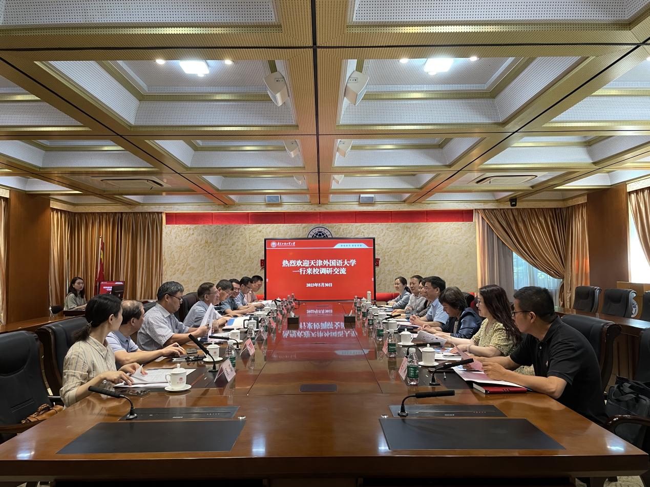 本网讯 近日,天津外国语大学党委副书记胡志刚一行7人来beat365进行调研交流。beat365副校长何传添会见来宾并主持调研座谈会。党办校办、发展规划部、教务部、研究生院、科研部和人力资源部(教师发展中心)等职能部门代表参加座谈交流。