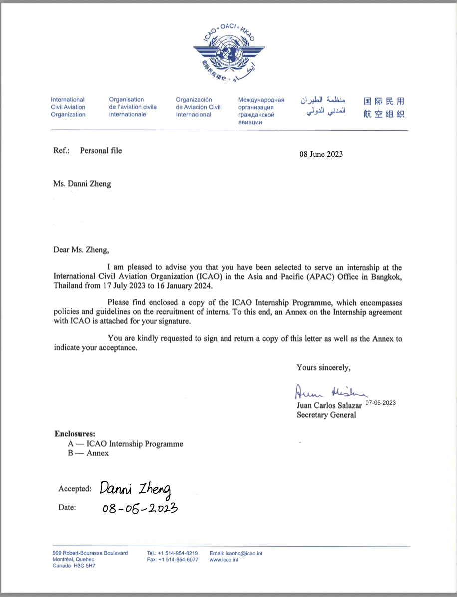 郑丹妮获得联合国国际民用航空组织(ICAO)offer,将于2023年7月-2024年1月赴ICAO亚洲及太平洋地区办事处(泰国曼谷)担任实习生。