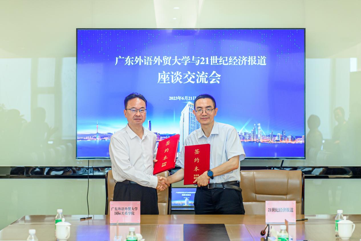 本网讯 6月21日上午,国际关系学院与21世纪经济报道实践教学基地签约揭牌仪式在南方财经全媒体集团广州总部举行。会上,双方围绕人才培养、科学研究、国际合作交流等话题进行了深入交流。