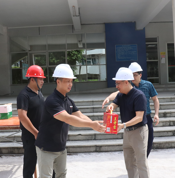 本网讯 高温酷暑,热浪袭人。学校利用暑期加快推进系列基建和修缮项目建设,力求实现校园基本建设的高质量发展。8月2日,副校长刘海春来到基建项目工地现场,看望和慰问在高温下辛勤工作的一线员工,为他们送去防暑降温饮品。基础建设部、总务后勤部等部门负责人参加慰问活动。
