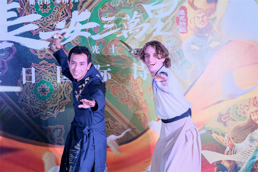 不仅是“玉真公主”们,在“秋日国际诗宴”上,来自委内瑞拉的两位留学生身着精美的汉服,在台上潇洒展示舞剑的动作,颇有江湖侠客风范;同样来自委内瑞拉的苏菲堪称“行走的词典”,她用中文、西班牙语、英语、客家话为现场的观众们送上真挚的中秋祝福,收获热烈的掌声与欢呼声……而作为“早茶爱好者”的智利留学生徐徐俊杰,第一次穿上了曾想尝试的汉服,他也坚定地表示:“希望借助留学生的身份,学习并传播好中华文化。”