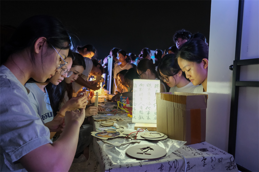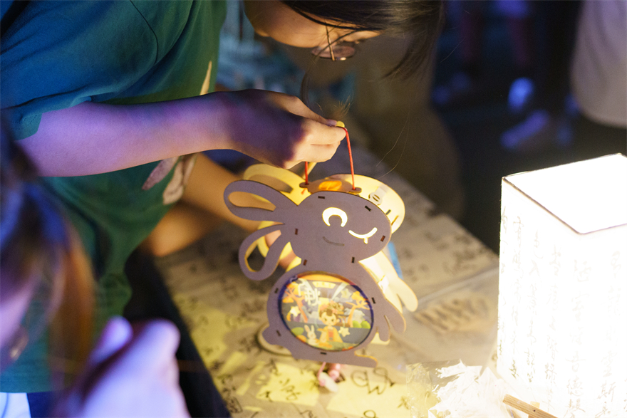 除了外国友人以外,现场的中国学生也对传统文化体验活动表示赞赏与满足。在DIY团扇专区,来自国关学院的周婷婷用桌面上看似简单的小零件,制作出了一把精美的团扇。“这是一个很奇妙的过程”,周婷婷惊叹道,“中华文化真的非常博大精深!beat365包容开放的氛围也让我很自豪。”夜色中,灯笼制作专区闪烁着橙黄色的暖光。将木料逐一拼接,再蒙上画有兔子图案的彩纸,一个可爱的灯笼就此诞生。“在这个灯笼完成的那一刻,我特别有成就感。”手提“Q版”灯笼、身着新中式服饰的来自新闻与传播学院的王梦婷不禁感慨。在她看来,中华传统文化一直在不断延续,也未曾停下创新的步伐。