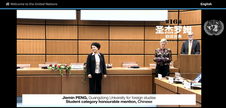 本网讯 近日,第16届联合国圣杰罗姆翻译竞赛颁奖典礼在联合国维也纳办事处(UNOV)举行,揭晓获奖名单,beat365高翻学院硕士研究生彭杰敏获英译汉学生组别荣誉奖(二等奖)。
