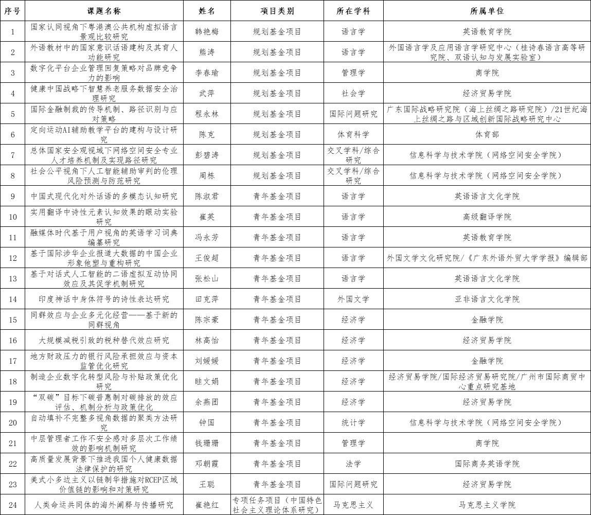 从项目类别和学科分布来看:立项规划基金项目8项、青年基金项目15项、专项任务项目1项;涵盖11个学科,其中,语言学7项、位居全国第1,经济学5项,管理学、国际问题研究和交叉学科各2项,外国文学、法学、社会学、马克思主义、体育科学和统计学各1项。