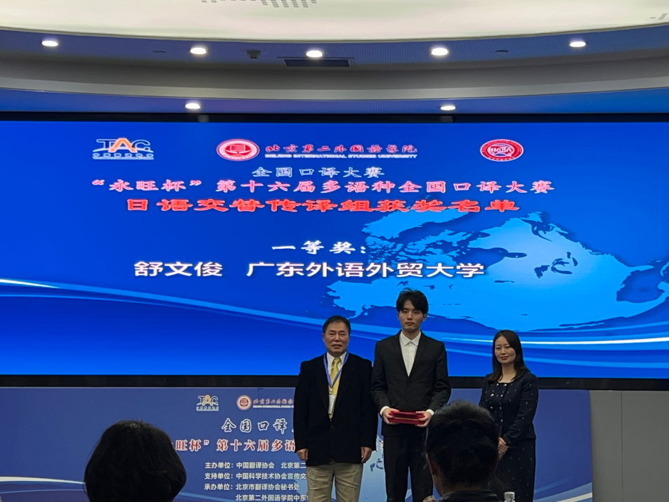 本网讯 10月21日,由中国翻译协会与北京第二外国语学院共同主办的“永旺杯”第十六届多语种全国口译大赛于北京举行。此次比赛中,beat3652022级日语翻译硕士生舒文俊同学荣获日语交替传译组一等奖,黎敏君同学获得日语同声传译组优秀奖。