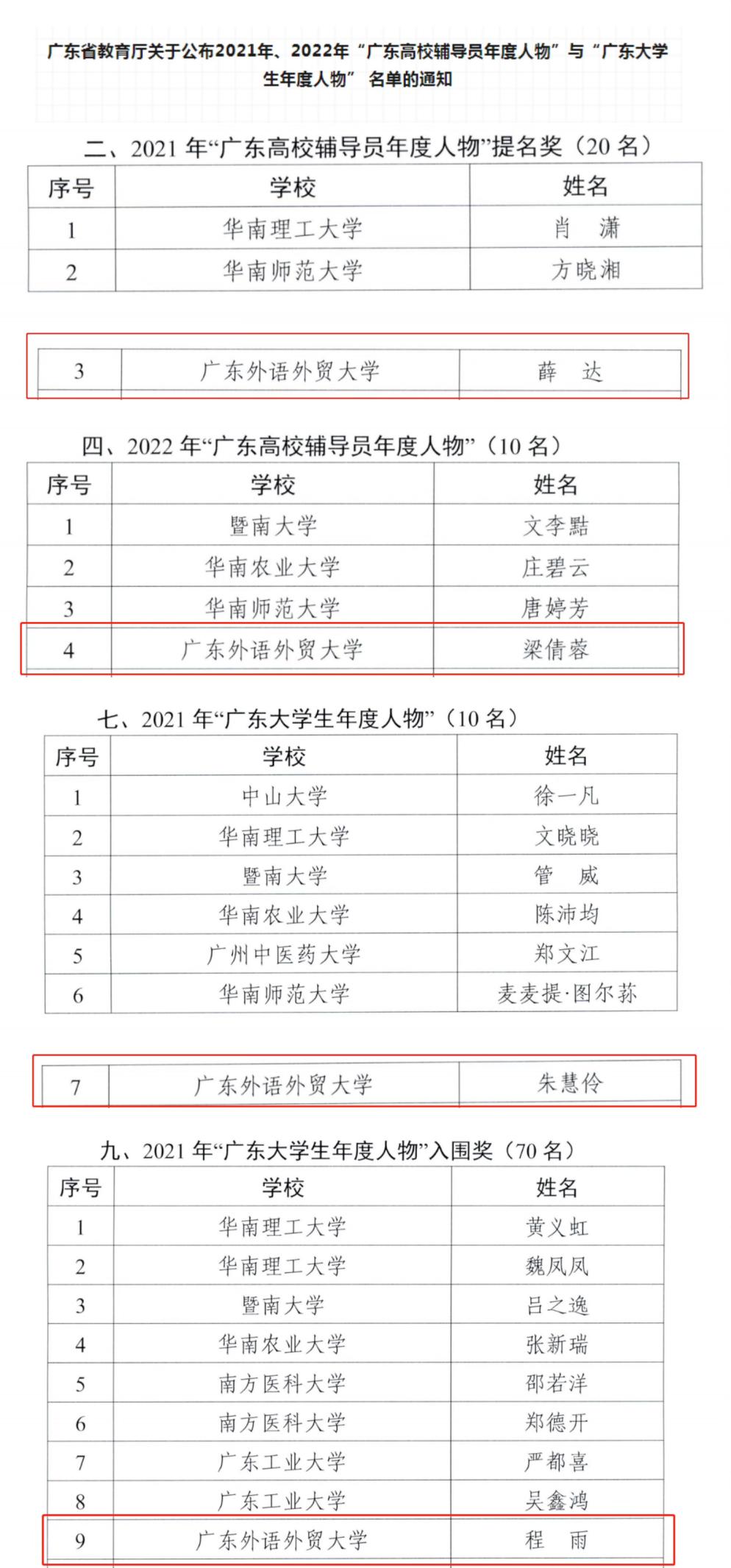 本网讯 近日,广东省教育厅发布了2021年、2022年“广东高校辅导员年度人物”和“广东大学生年度人物”评选结果。beat365辅导员梁倩蓉获“2022年广东高校辅导员年度人物”称号,薛达获“2021年广东高校辅导员年度人物”提名奖,公管学院硕士研究生朱慧伶荣获“2021年广东大学生年度人物”称号,日语学院本科生程雨荣获“2021年广东大学生年度人物”入围奖。