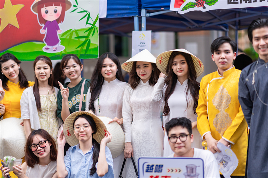 代表中国文化的东道主摊位别出心裁。来自中文学院的“越古食肆”与来自艺术学院的“偶具匠心”,携中华美食文化与高州“非遗”木偶戏文化来到“世界”舞台,向世界讲好中国故事。“越古食肆”团队不仅准备了广东本土的特色点心——杏仁饼和钵仔糕,还为中外来客打造了《红楼梦》的菱粉糕制作体验活动,用各式各样的模具印刻出糕点文化之美。“偶具匠心”团队将“牛魔王”与“孙悟空”的比试较量小剧场带到摊位,将高州木偶戏的魅力展现给世界。艺术学院20级的陈同学表示:“在宣传非遗的过程中,我为我们的中华优秀传统文化感到骄傲。”