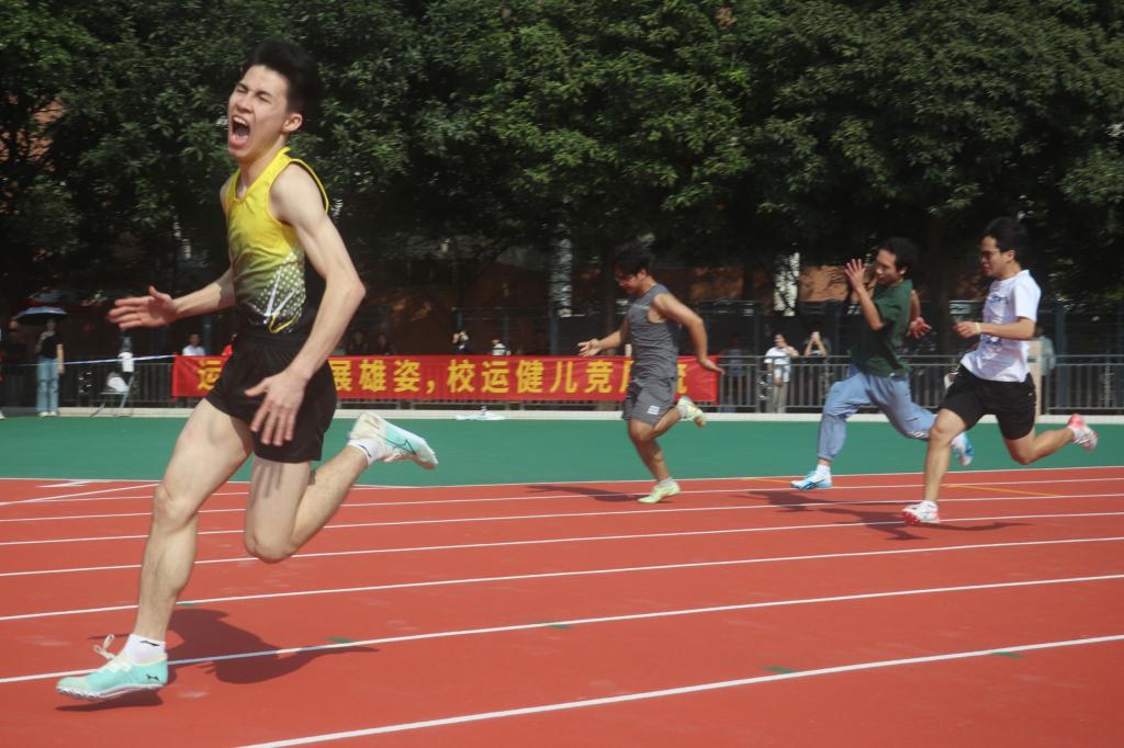 “各就位!”选手们右脚蹬于起跑器上,前腿弯曲,低头静止。只见发令枪响,选手们像离弦的箭一样瞬间冲出。陈子杨和杨锦霖在男子100米决赛的8名选手中处于领先地位,他们旗鼓相当、难分伯仲,两人的身影常在交叠的一瞬间又远离,随后又再次重合。最终,陈子杨以0.02秒的关键优势率先迈过终点线,摘得桂冠。