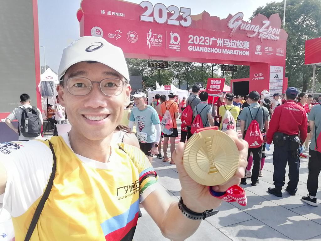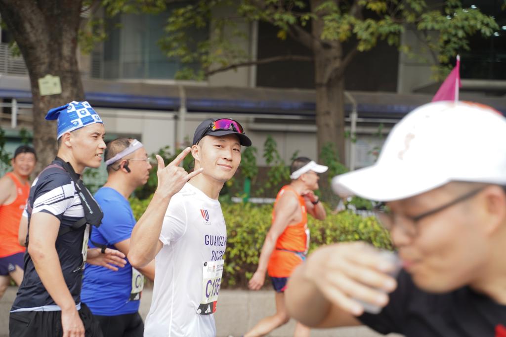 在广马的第十周年,张福纯又重新回到了熟悉的战场。“今天又晒又热,湿度又高,跑全马真的太累了!”全马35公里时,已是接近运动员的极限,身体上又渴又饿又累,这时张福纯开始倒计时,靠意志力战胜身心上的双重困难,支撑自己全力冲向终点……
