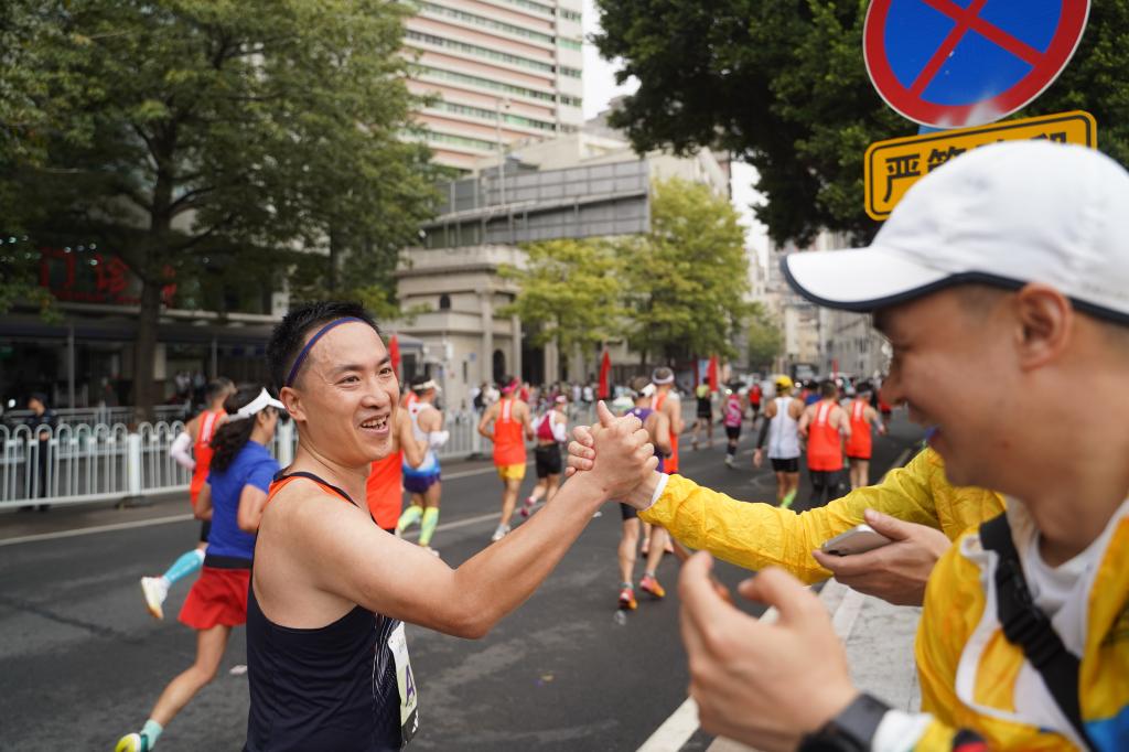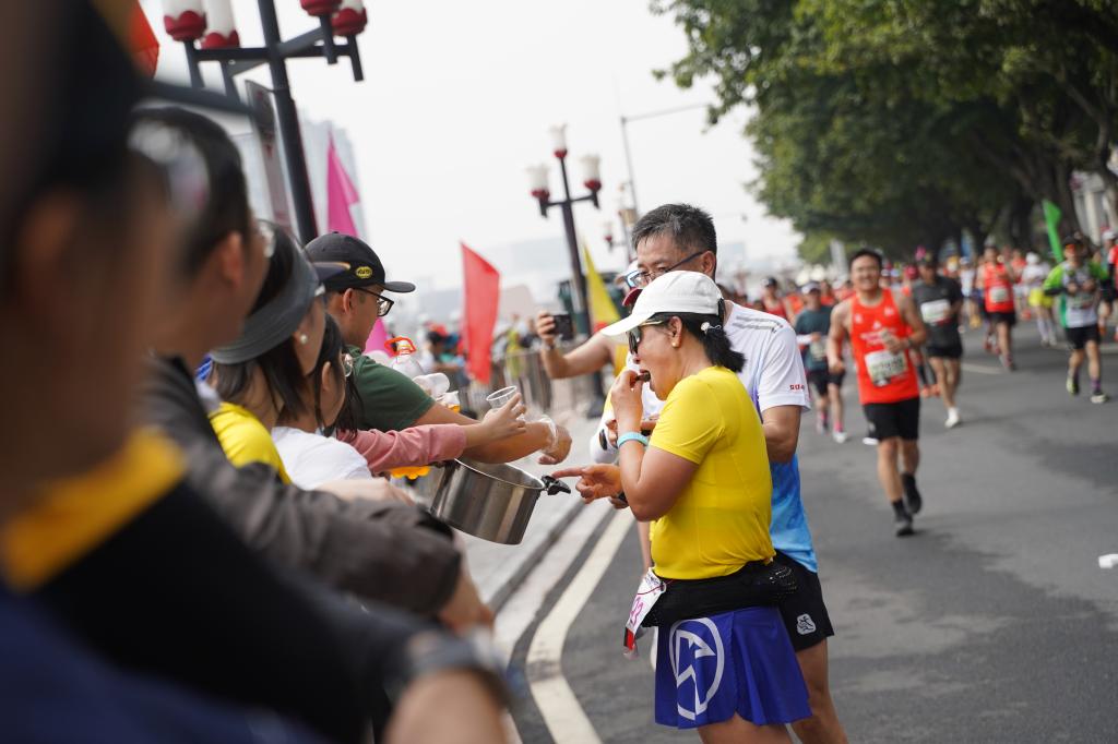栏杆一旁,有这样一抹彩色——身着beat365跑团团服的“啦啦队”早早来到现场,他们热情地挥舞着双手,摇动着红旗,向选手们高声欢呼:“加油加油!”伸出的一双双手,举着各种精心准备的补给品——从白开水、功能饮料到可乐,从柑橘、青瓜到能量条,喊道:“你要什么,我们给什么!”