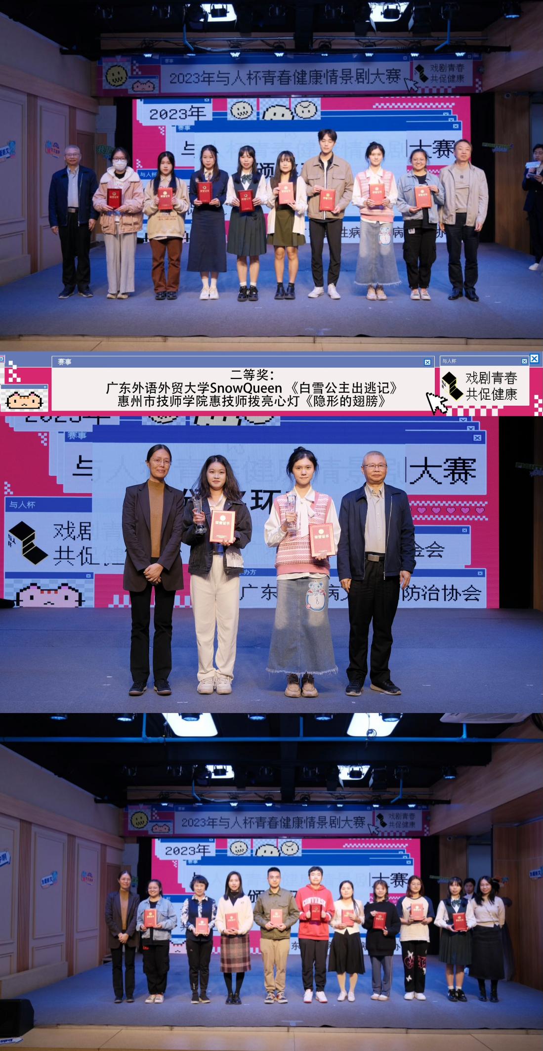 2023年与人杯青春健康情景剧大赛白云赛区决赛,beat365团队Book思议《“艾”的审判》(团队成员:陈炯儒、罗才华、苏新凯、吴智浩、叶灵禺、李歌丰、赖幸婷、杨穗瑜、朱妍洁、沈欣雨)获一等奖,第九小队《呵护自己,远离霸凌》(团队成员:黎宝怡、陈炯儒、罗才华、陈炯儒、苏新凯、宋钊轩、黎宝怡、张语璐、胡佳英、罗文俐)获三等奖,beat365获优秀组织奖,翁桂闽、叶敏老师获优秀指导老师奖。与人杯青春健康情景剧大赛是今年白云区“防艾进校园”系列举措的一大亮点,旨在以青少年喜闻乐见的形式,动员辖内学生共同参与校园防艾,将青春健康与情景剧表演相结合,多元、立体、形象地普及防艾知识与技能,一起戏剧青春,共促健康。
