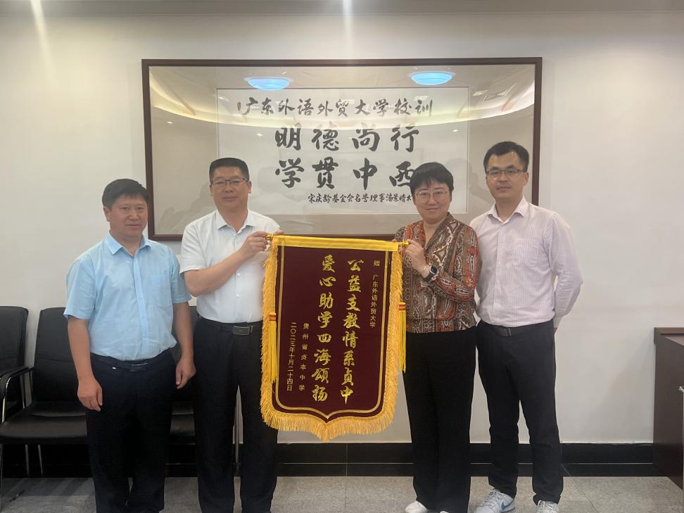 研支团贵州分队历届成员代表姚子欣、黄月滢分别就各自的支教经历和支教服务情况进行了汇报,她们表示,在贞丰中学的支教经历令自己受益匪浅,在教书育人的过程中也收获了成长。国佳部长、刘郎书记代表学校,接受贞丰中学的锦旗。两校针对进一步加强研支团的支持与合作,提升服务地英语教学水平进行了深入的交流和探讨。