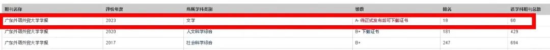 《中国学术期刊评价研究报告》对全国6469种中文学术期刊进行认定评价,按学科分类,根据期刊的综合评价得分排名并划分等级,其中,A+等级为权威期刊,即排名前5%的期刊;A等级和A-等级为核心期刊,分别为排名5%-20%和20%-30%的期刊。