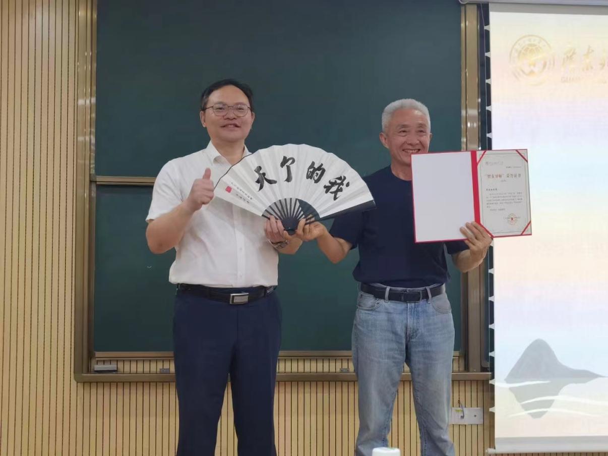 刘建达为戴建业颁发智友导师证书和以其书名《我的个天》命名的纪念折扇