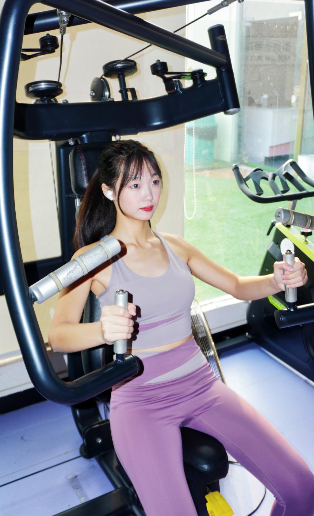 彭子茵在健身房的各种器材上进行锻炼