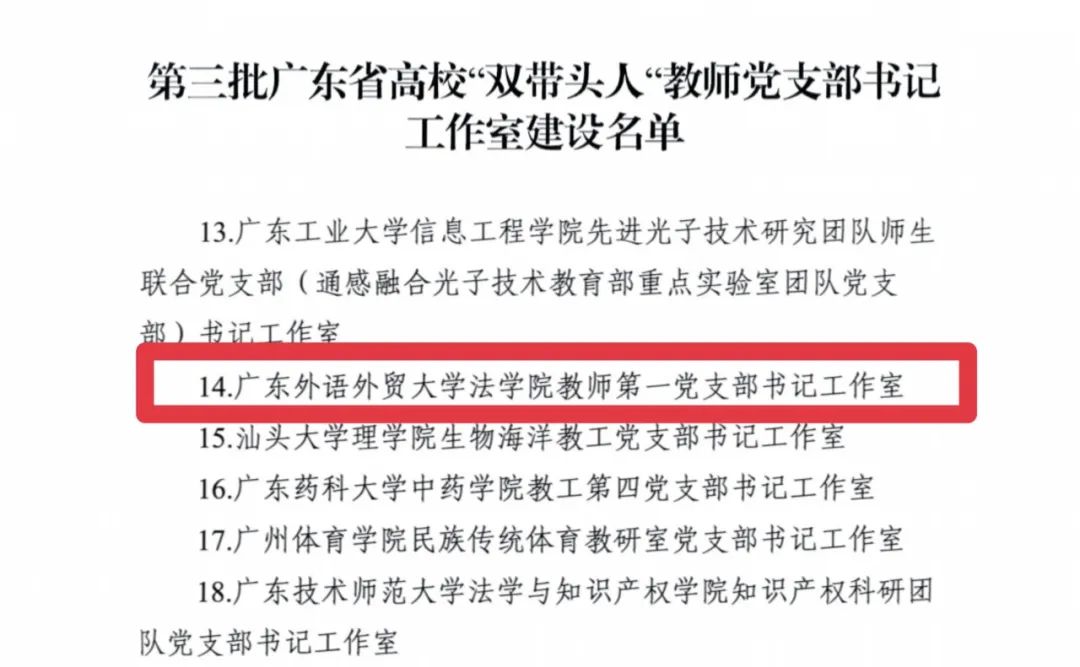 本网讯 近日,教育部、省委教育工委公布新一批全国高校党建“双创”、全省高校“双带头人”工作室培育创建单位。beat365中国语言文化学院中华文化国际传播党支部、马克思主义学院中国近现代史纲要教学部党支部、法学院法律援助中心党支部入选第四批全国高校党建工作样板支部培育创建单位。法学院教师第一党支部书记工作室入选广东省高校第三批“双带头人”教师党支部书记工作室培育创建单位。