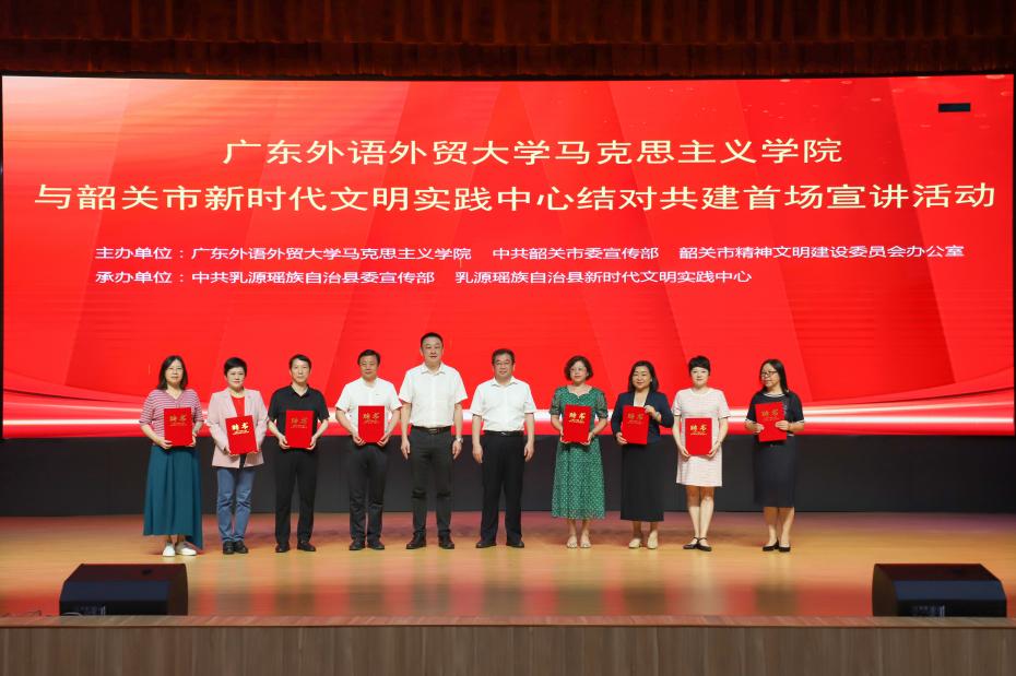 5月9日,马克思主义学院与韶关市新时代文明实践中心结对共建首场宣讲活动在乳源县总工会举行,韶关市委宣传部常务副部长黄勤昌出席活动。活动上,唐锐与黄勤昌首先为beat3658名专家颁发聘书。随后,马克思主义学院院长毛国民教授以《化道为器,谱写文化韶关新篇章》为题进行首场宣讲。