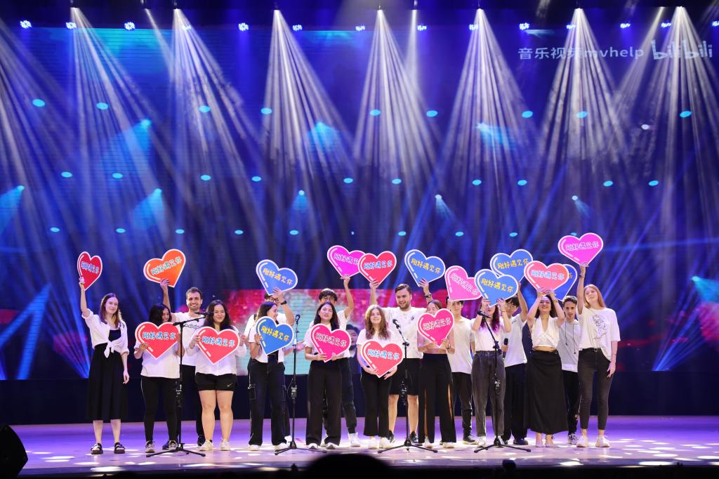 晚会开始前,中外师生在会场体验穿汉服。现场还设置了汉字游戏,留学生们在游戏中竞猜、学习,汉字化作桥梁,连接着不同国家青年的心,共同编织着多彩的语言梦。