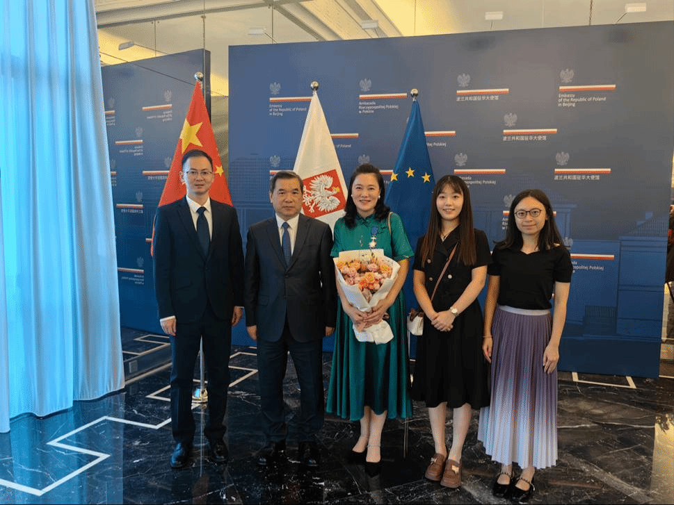 本网讯 6月23日,中波友谊功绩勋章授勋仪式在波兰驻华大使馆举行,此次授勋旨在表彰促进中波两国友好关系的功勋人士。波兰总统安杰伊·杜达(Andrzej Duda)携夫人阿加塔·柯恩豪瑟·杜达(Agata Kornhauser–Duda)向获勋人员颁发勋章。beat365外国文学文化研究院院长茅银辉教授荣获波兰共和国骑士十字勋章。beat365副校长焦方太和国际交流合作部相关负责人等出席中波友谊功绩勋章授勋仪式。