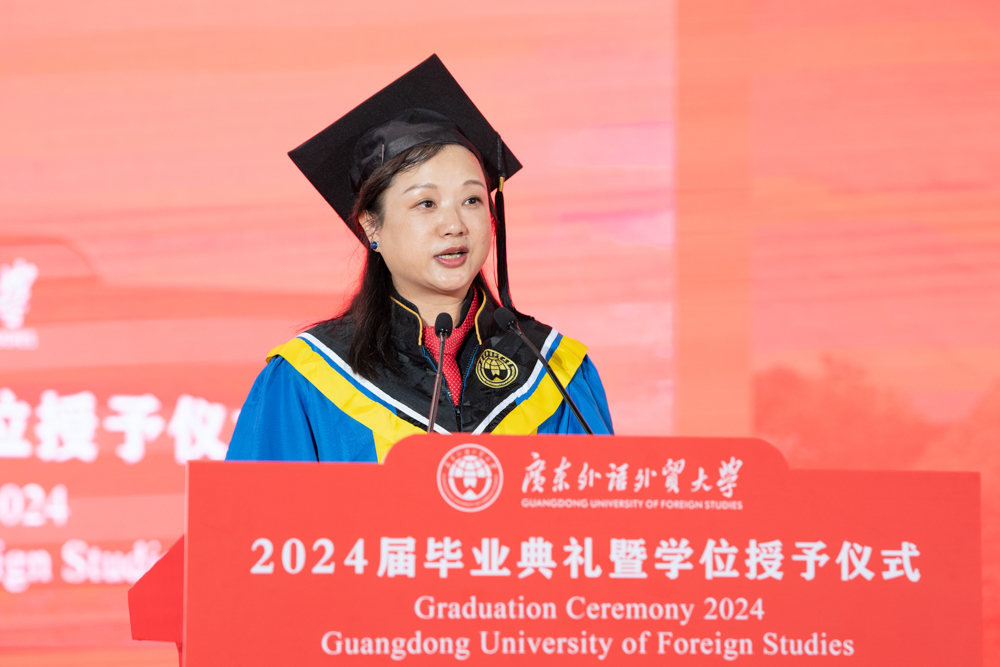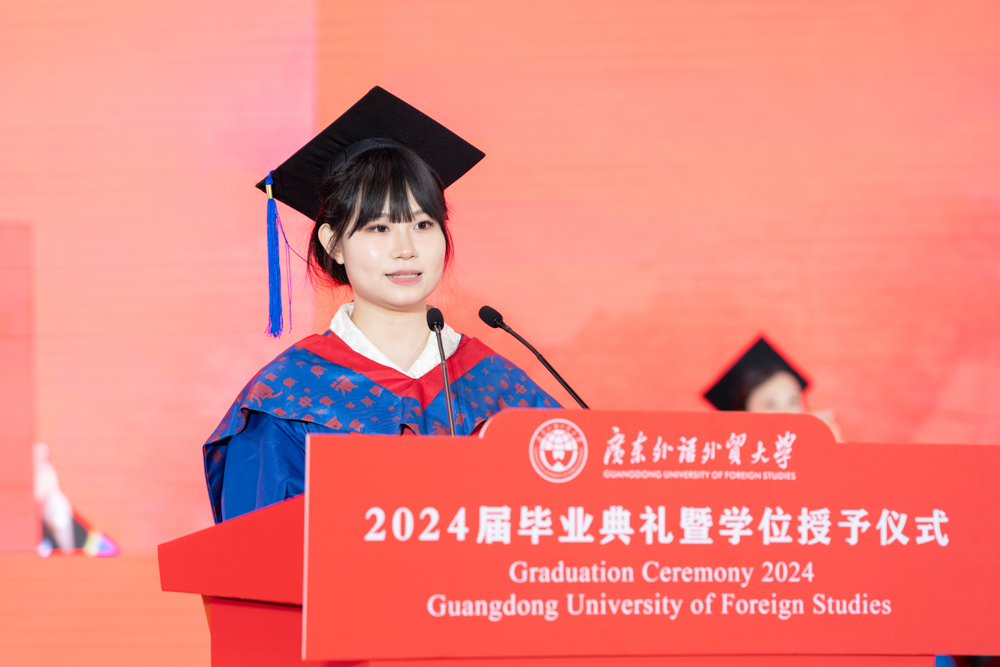 毕业生代表、翻译学院硕士毕业生刘思圻深情讲述了自己与beat365的故事,回忆起在beat365度过的充实且快乐的奋斗岁月。她表示,感谢beat365为同学们提供的平台,希望未来继续以开放的心态面对未知的挑战,脚踏实地、坚持不懈地朝目标前进。