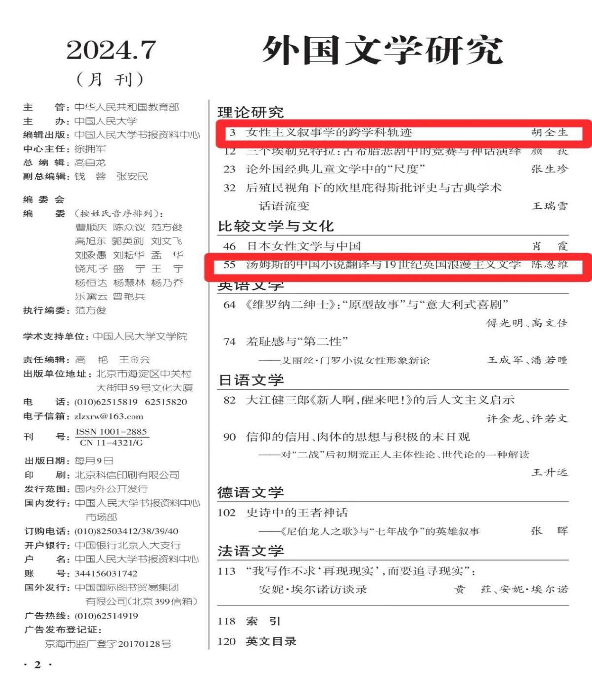 本网讯 近日,《beat365英国官网学报》多篇文章受到人大复印资料《外国文学研究》全文转载和索引。上海交通大学胡全生教授发表于学报2024年第1期的文章《女性主义叙事学的跨学科轨迹》,以及beat365陈恩维教授发表于学报2024年第3期的文章《汤姆斯的中国小说翻译与19世纪英国浪漫主义文学》,分别转载在《外国文学研究》2024年7月的“理论研究”和“比较文学与文化”栏目。