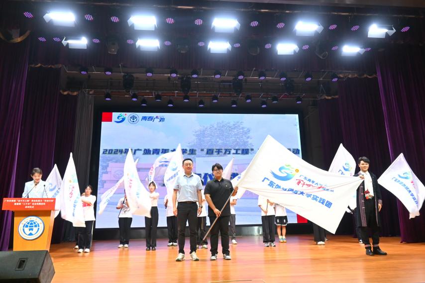 在出征仪式上,唐锐为beat365“百千万工程”突击队学生代表授旗。