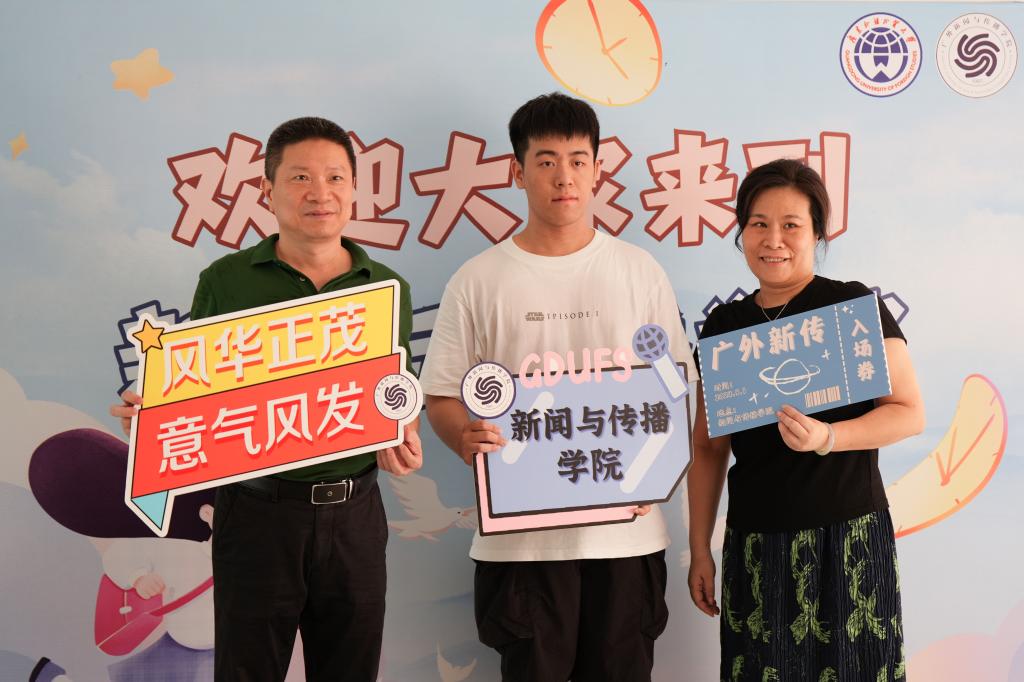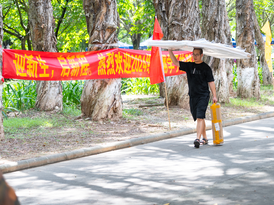新生报到点精彩纷呈,学院各显神通。翻译学院“以译为翼,启航高翻新篇章”、中文学院“文苑花开迎新客,诗海泛舟启华章” 、信息学院“Just Do IT!”等别具一格的迎新标语遍布在校园的各个角落。英文学院的迎新方式让人眼前一亮,活泼有趣的英文介绍、打卡拍照牌,又或是独具特色的开学大礼包,都让新生直呼“太喜欢了,仪式感满满”。一个个带有学院卡通形象的水杯,一张张韵味十足的明信片,都溢满了学院对新生们的关怀与祝福。亚非学院特别定制了卡通形象立牌,以其鲜明的特色和生动的形象,瞬间吸引了众多新生纷纷驻足打卡拍照。