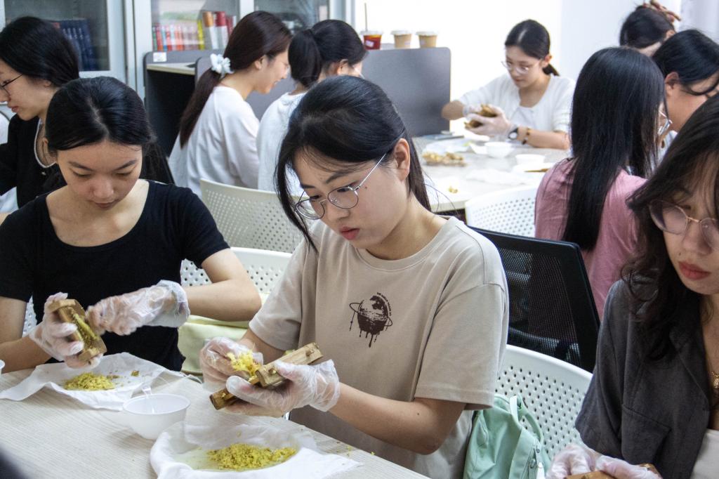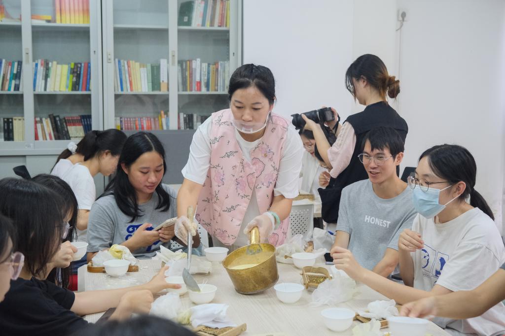 在姜埋奶体验活动中,同学们在老师的指导下学习姜埋奶的制作,感受传统甜品的独特香醇。金融学院吴同学表示,此次非遗体验活动是beat365人文关怀的体现,她感叹道“来对了”,同时希望学校多举办非遗传承的活动。见同学们对传统美食赞不绝口,姜埋奶制作技艺传承人卢子壕老师表示,十分欣喜于学校对非遗传承的重视。她期待同学们能“多吃一点传统、多学一点传统”,并将姜埋奶背后孝顺的精神内核理解传承下去。