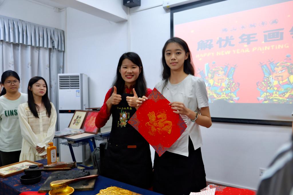 佛山木板年画体验活动上,刘钟萍老师用生动幽默的讲解,揭开一幅幅年画背后的故事与寓意,吸引同学们踊跃进行互动。他们拿起已雕刻好的木板,看见一刀一划所传达出的匠心与细心,再将木板放在纸上,双手稳按,滚筒均匀滚动,揭开木板,鲜艳灵动的色块交错成画。同学们将对自己的期许注入一按一揭的动作中,再对自己亲手制作的年画作品进行细致的打包与安置。刘钟萍老师表示,未来还会开展很多活动,“如果同学们合适、感兴趣或顺路,我们可以一起探讨。”