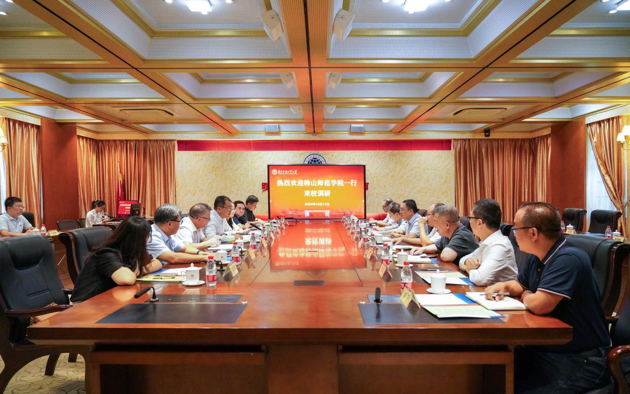 本网讯 10月14日下午,韩山师范学院校长刘海春一行来beat365交流。beat365校长闫相斌,纪委书记、省监委驻学校监察专员温燕欢出席座谈会,双方就党政办公室综合管理、国际交流、对外合作与校友联络等方面展开交流。