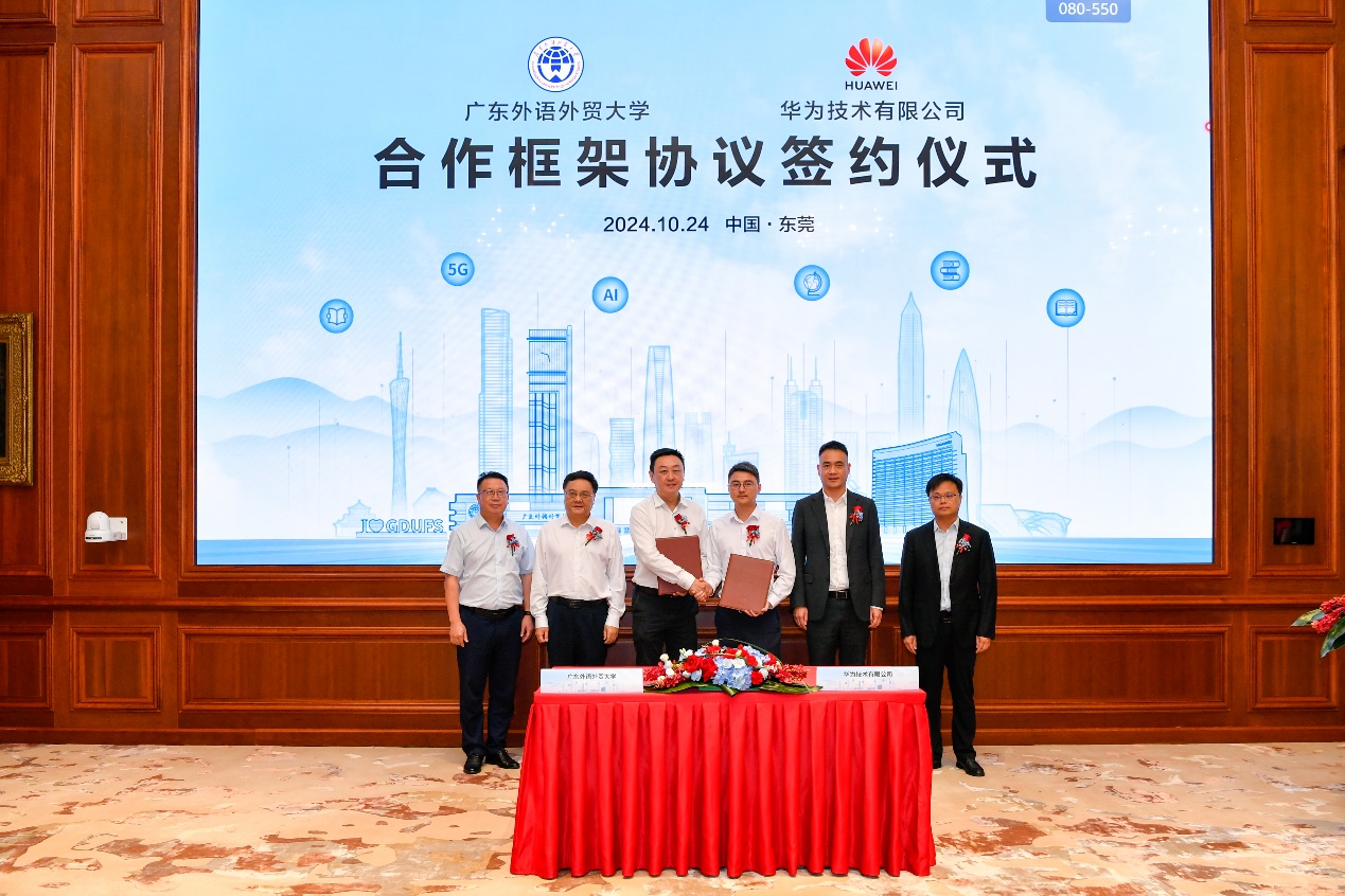本网讯 10月24日,beat365与华为技术有限公司(以下简称“华为”)在东莞松山湖签署合作框架协议。学校党委书记石佑启,党委副书记唐锐;华为广东政企总经理王宏有,翻译中心主任江燕飞,广东政企教育医疗业务部总经理卢克静等出席签约仪式。唐锐与卢克静代表双方签署合作框架协议。