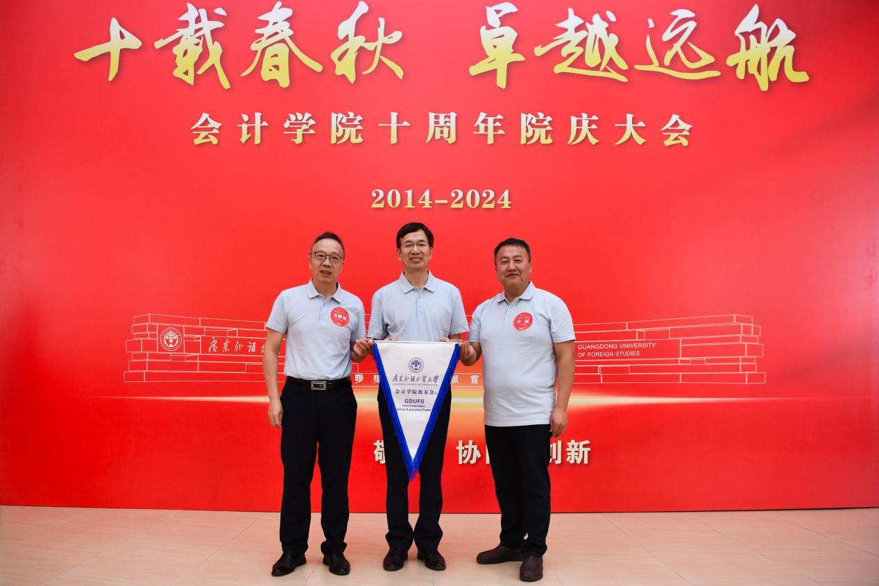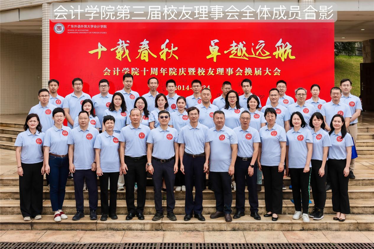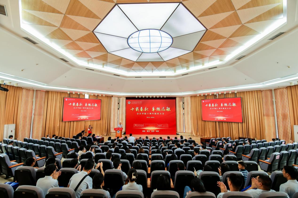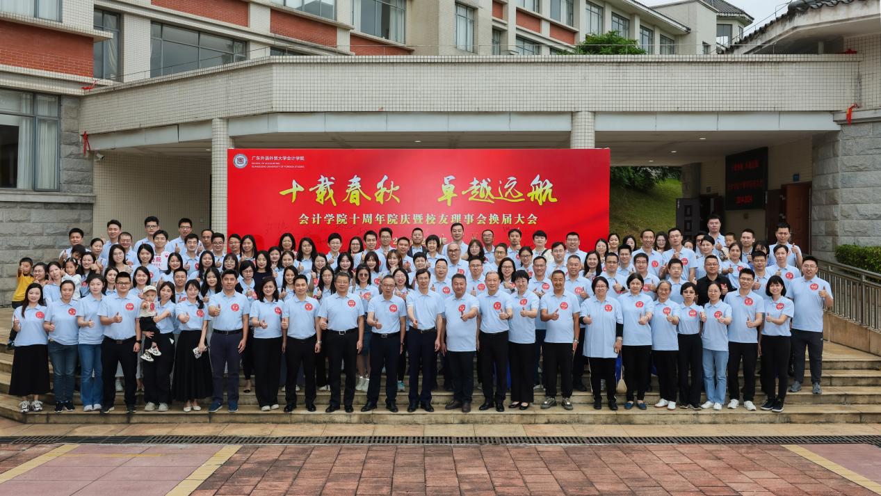 本网讯 11月2日,会计学院“十载春秋,卓越远航”十周年院庆暨校友会理事会换届大会在大学城校区举行。校党委常委、副校长何传添、学生工作部部长国佳、校办副主任杨博、发展规划部副部长刘祥和、商学院党委副书记沈长霞以及地方校友会代表、学院退休教师代表、学院历届校友共计200余人欢聚一堂,共同见证学院第三届校友会的换届,一同庆贺会计学院成立十周年。会议由学院党委书记黎冬主持。