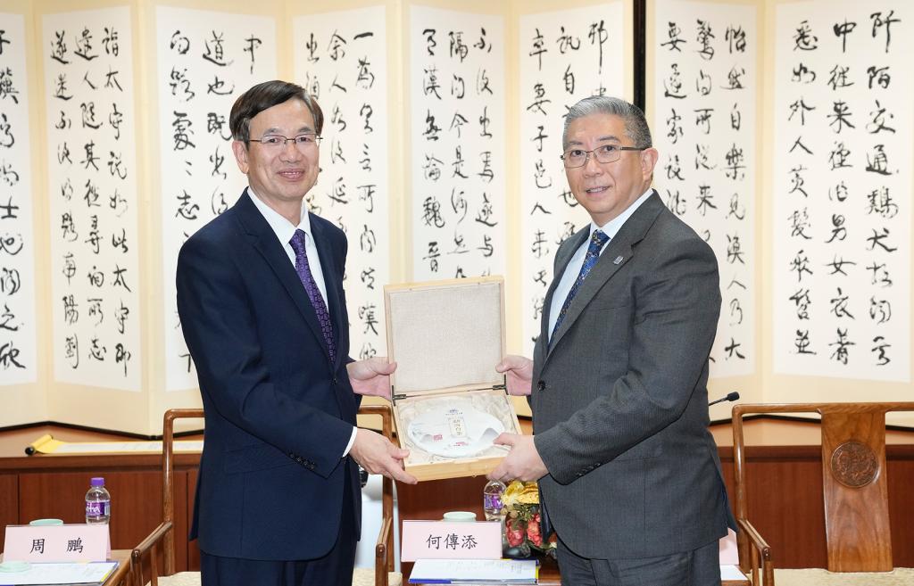 12月6日下午,何传添一行先后拜访了澳门城市大学及澳门科技大学。在澳门城市大学期间,该校校长刘骏、教育学院院长程李颖、人文社会科学学院副院长黄国文参与座谈。刘骏校长向代表团介绍了澳门城市大学的历史、发展与愿景,提出了以数据科学赋能语言与文化、金融科技、大健康等各领域的建设理念,并期待与beat365开展更多合作,推动两校在新文科建设取得新的突破。何传添对刘骏校长等的欢迎表示感谢,并对澳门城市大学取得的进步和清晰的发展愿景表示认可,期待两校能发挥人文社科类高校资源优势,加强合作,合力服务国家和区域发展需求。访问期间,两校续签了合作备忘录和交换生协议。