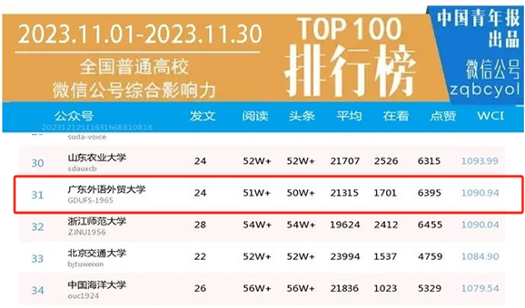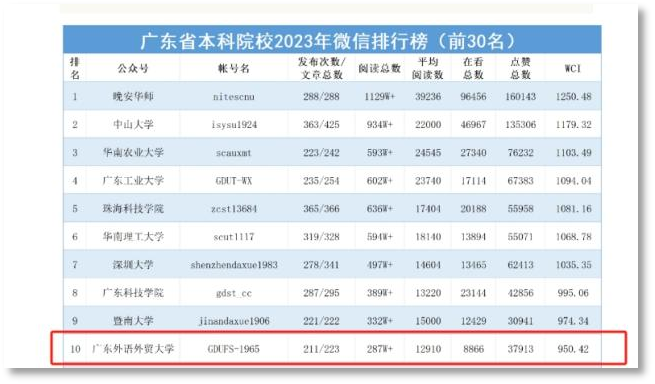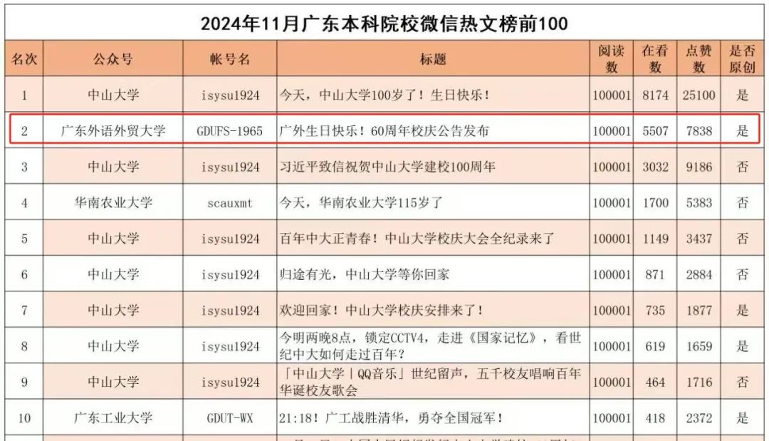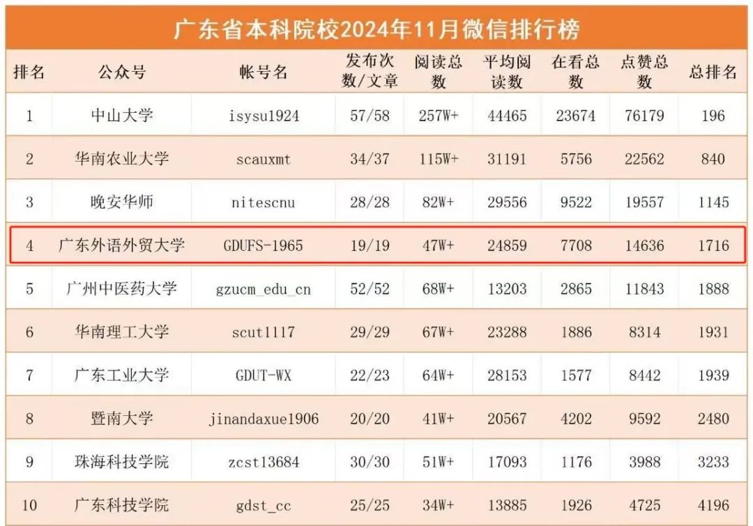 2024年,beat365官微阔步前行,多项排名再创新高。在广东省本科院校2024年11月微信排行榜排名第4,《beat365生日快乐!60周年校庆公告发布》等推文阅读量突破10万,在2024年11月广东本科院校微信热文榜排名第2。