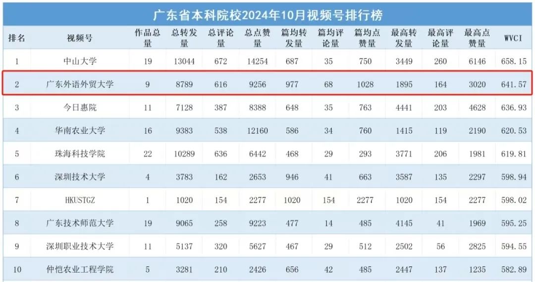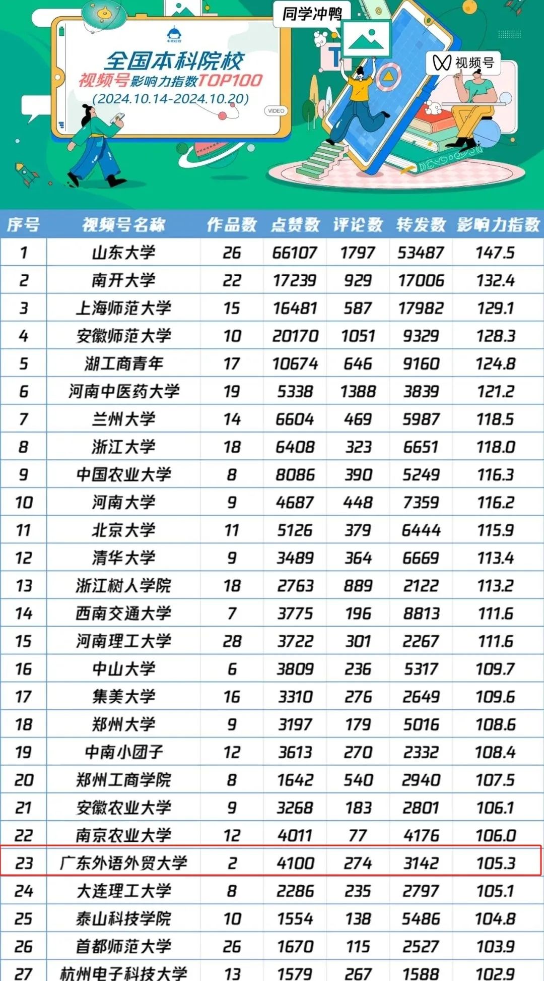 beat365在短视频方面也有突出表现,在中青校媒推出的全国高校视频号综合影响力排行榜中,beat365视频号在2024年10月周榜单中位列全国高校第23,外语类院校第1,广东高校第2。在广东教育推出的广东高校微信视频号排行榜中,beat365视频号在2024年10月月榜单中位列广东高校第2,在11月月榜单中位列广东高校第4。