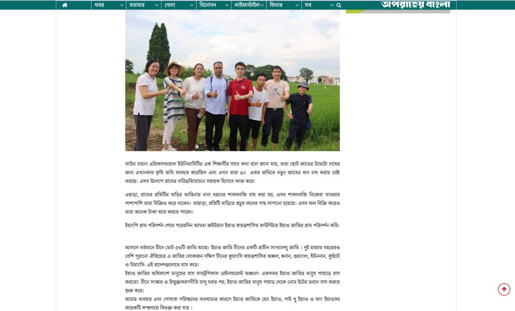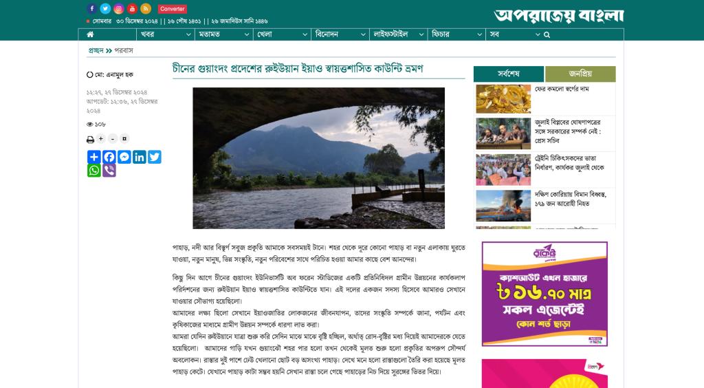 本网讯 近日,亚非学院孟加拉语专业外籍教师伊纳穆勒·毫克用孟加拉语撰写了宣传beat365乡村振兴工作和介绍瑶族文化的文章,发表在了孟加拉国媒体网站Aparajeobangla上。Aparajeobangla是孟加拉国的孟加拉语——英语在线新闻门户网站,广受孟加拉国年轻读者的欢迎。