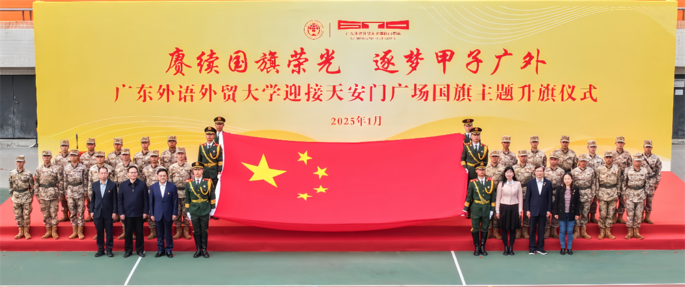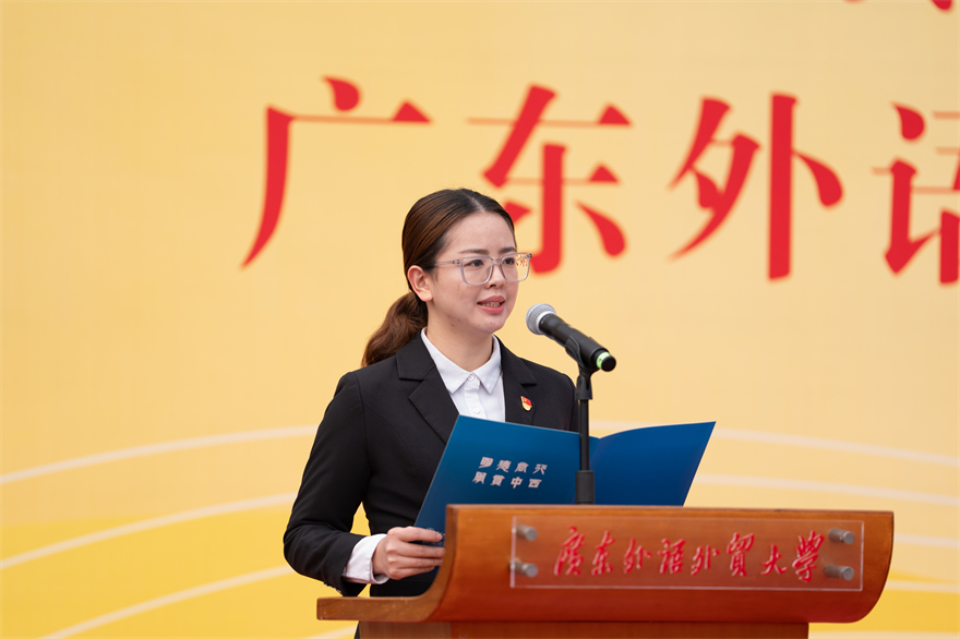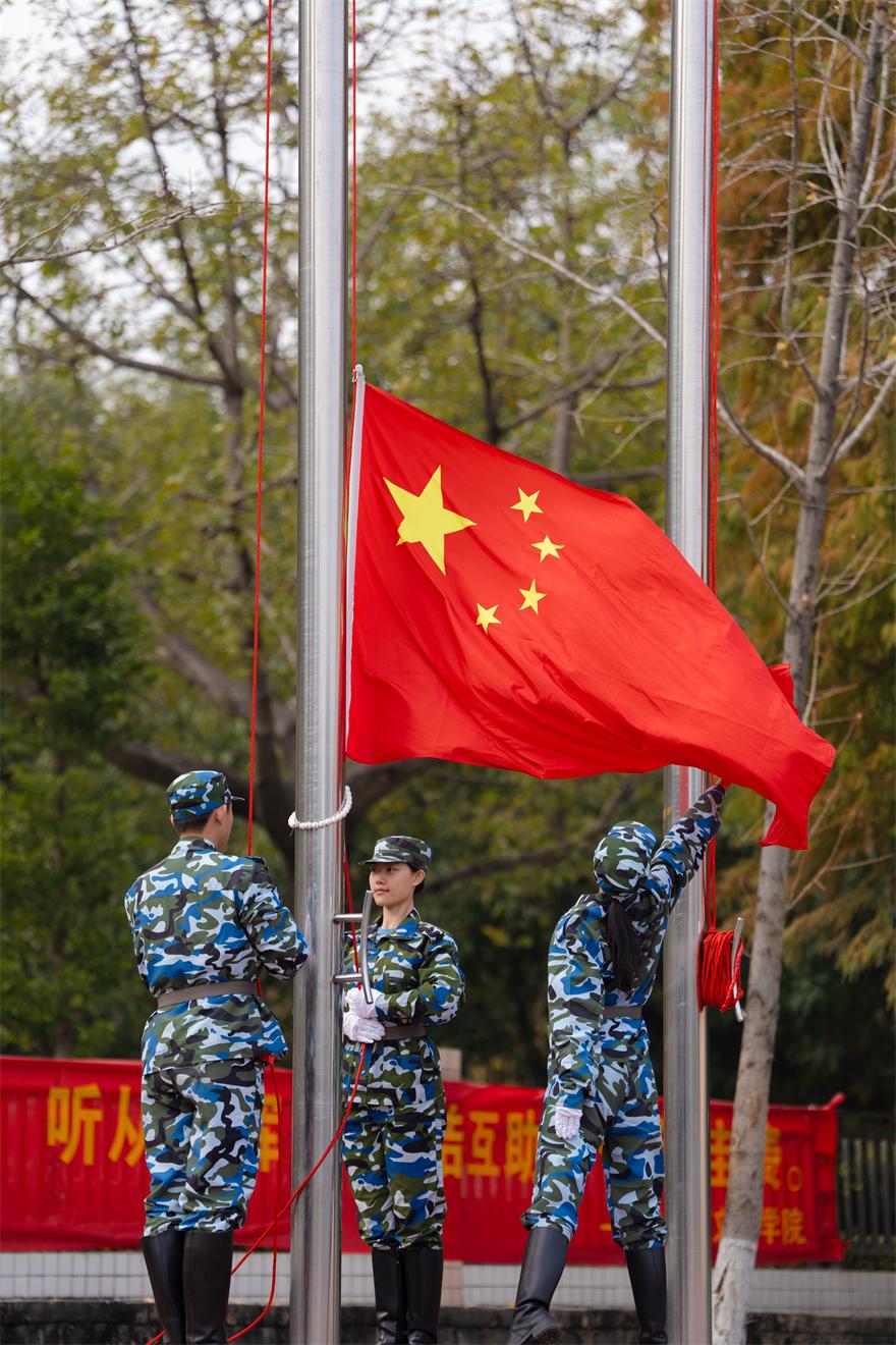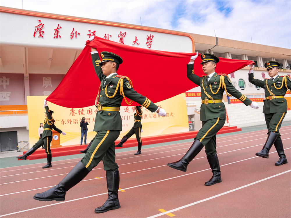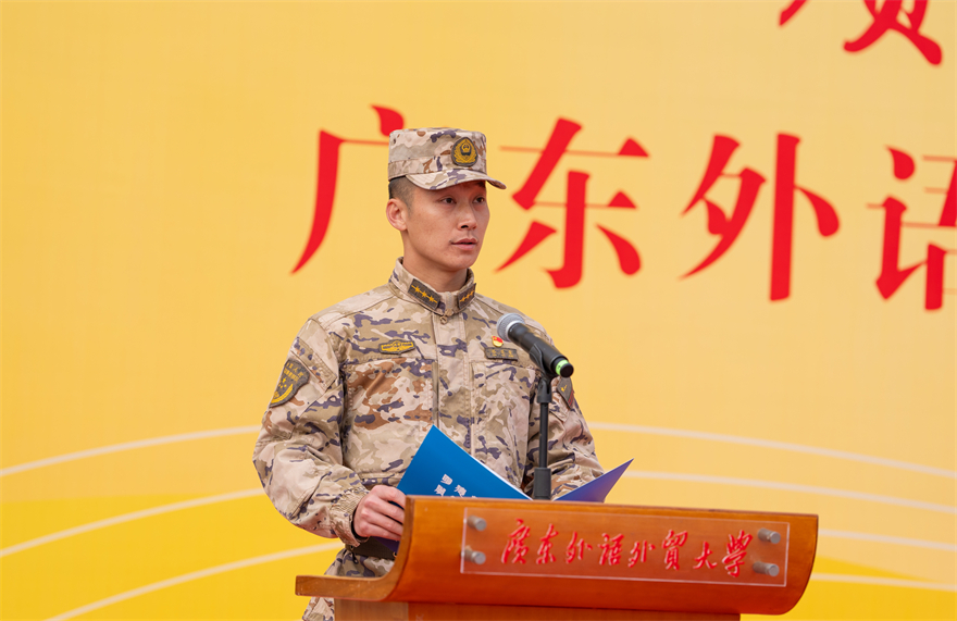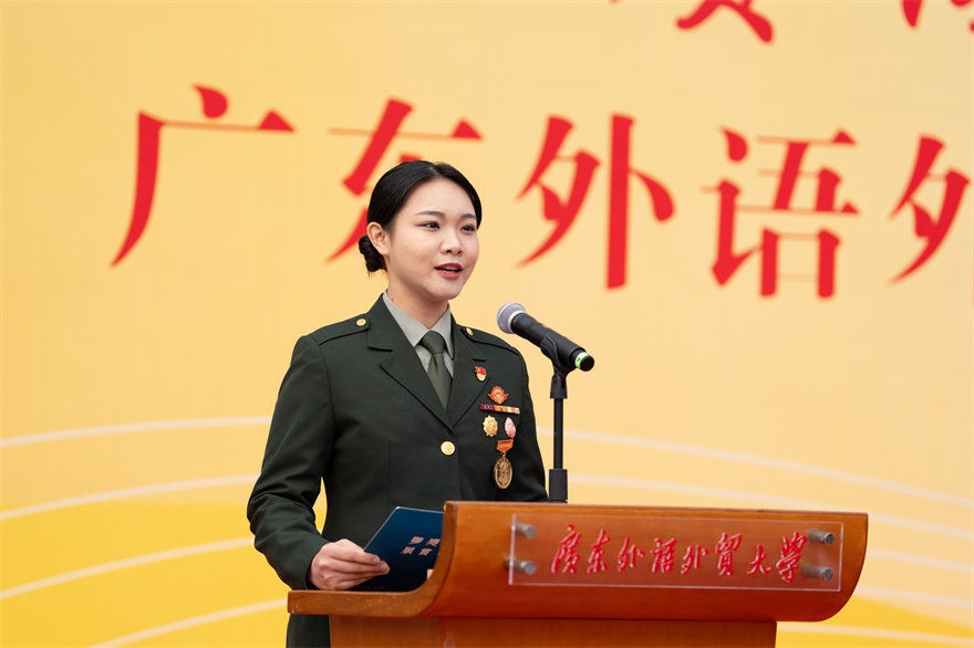 武警广东总队广州支队中队长蔡楚荣、学生代表胡叙妍、毕业生代表钟佩佩发表演讲。蔡楚荣提到,每一次执行任务,都是对国旗的一次深情致敬,每一次成功的归来,都是对国旗的一份庄严承诺。希望同学们把个人理想融入强国梦、强军梦,在天安门广场国旗的见证和激励下,以更加坚定的奋斗姿态投身到民族复兴的伟大事业。胡叙妍同学曾参军入伍并在高原地区担任导弹操纵手。她表示,新时代大学生要将个人理想融入国家发展的大局之中,将个人抱负植根于民族复兴的蓝图之中,踊跃投身社会实践的广阔天地,矢志不渝地为祖国的繁荣昌盛贡献自己的青春与智慧。钟佩佩校友在校期间凭借优异表现曾赴联合国总部实习。她谈到,在联合国实习时,每当经过联合国大门时,飘扬的五星红旗都有一股无形的力量在激励着她,时刻提醒她作为一名中国青年务必要好好工作,展现属于中国青年的优秀形象,为推动构建人类命运共同体贡献青春与力量。