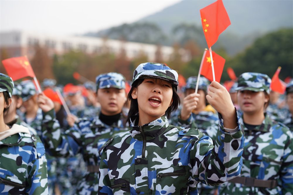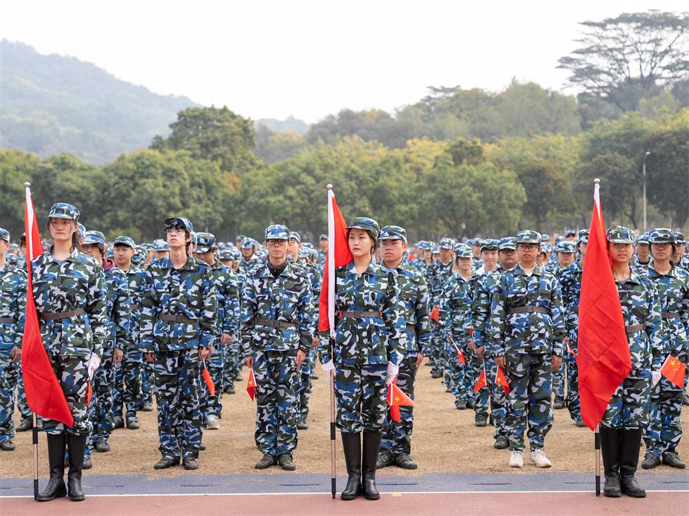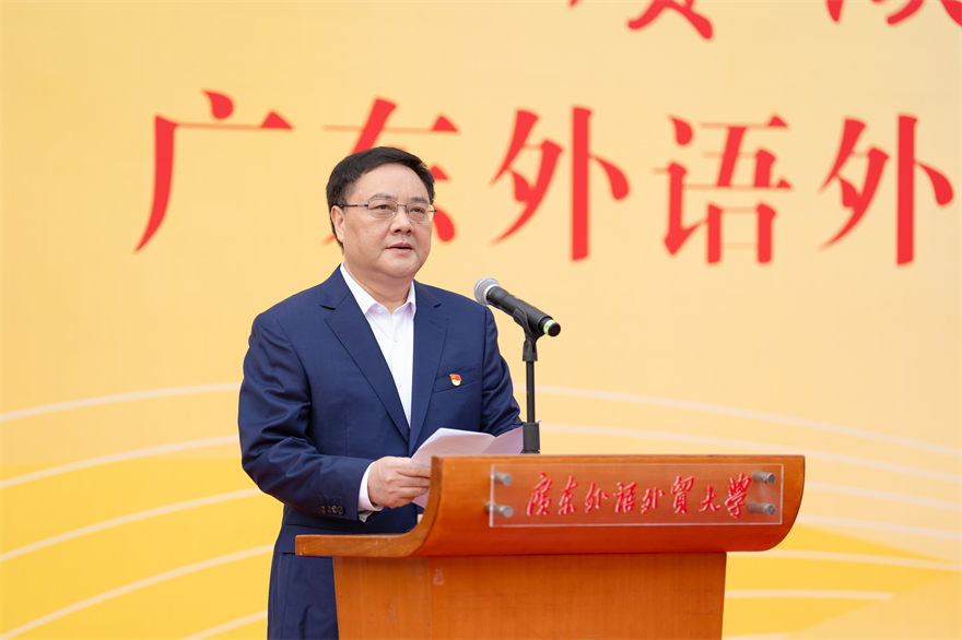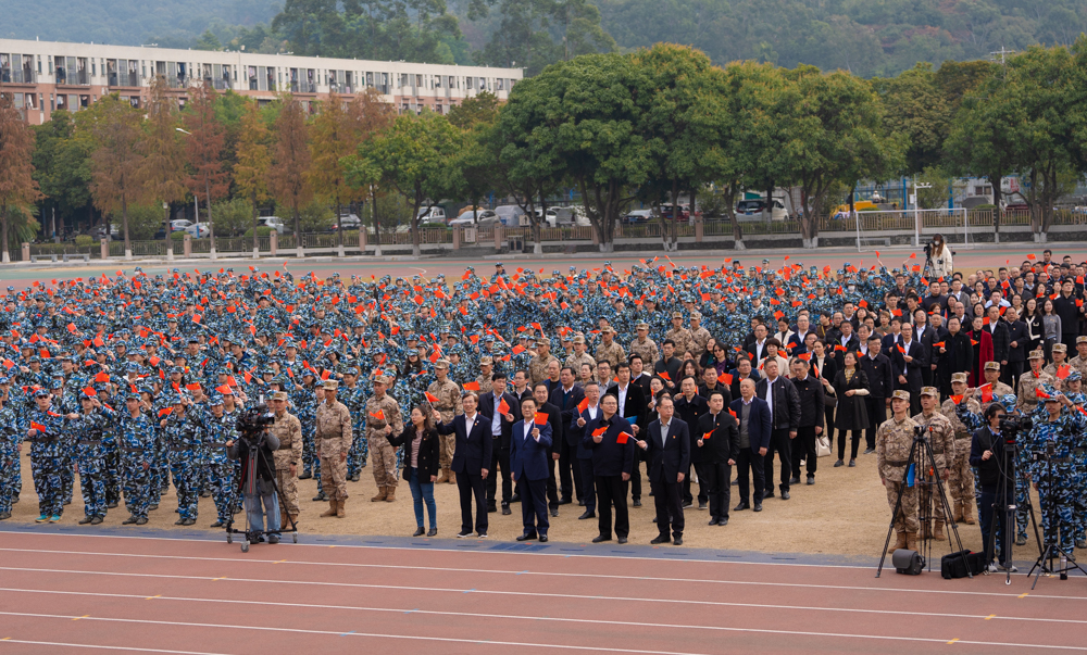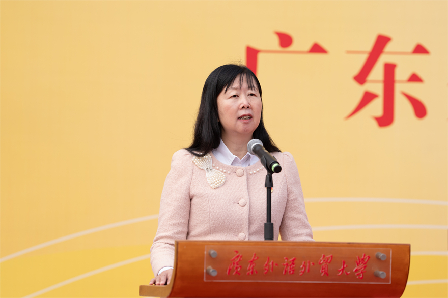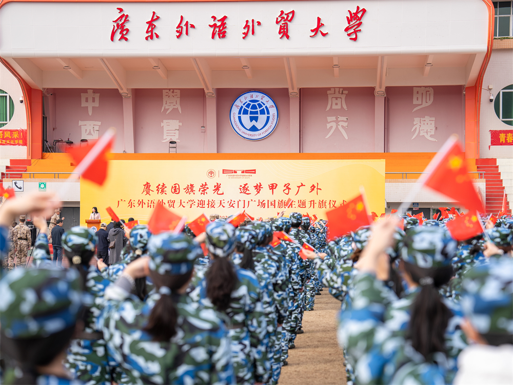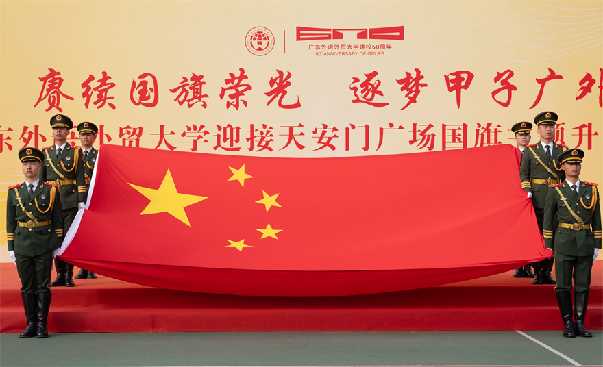 武警广东总队广州支队中队长蔡楚荣、学生代表胡叙妍、毕业生代表钟佩佩发表演讲。蔡楚荣提到,每一次执行任务,都是对国旗的一次深情致敬,每一次成功的归来,都是对国旗的一份庄严承诺。希望同学们把个人理想融入强国梦、强军梦,在天安门广场国旗的见证和激励下,以更加坚定的奋斗姿态投身到民族复兴的伟大事业。胡叙妍同学曾参军入伍并在高原地区担任导弹操纵手。她表示,新时代大学生要将个人理想融入国家发展的大局之中,将个人抱负植根于民族复兴的蓝图之中,踊跃投身社会实践的广阔天地,矢志不渝地为祖国的繁荣昌盛贡献自己的青春与智慧。钟佩佩校友在校期间凭借优异表现曾赴联合国总部实习。她谈到,在联合国实习时,每当经过联合国大门时,飘扬的五星红旗都有一股无形的力量在激励着她,时刻提醒她作为一名中国青年务必要好好工作,展现属于中国青年的优秀形象,为推动构建人类命运共同体贡献青春与力量。