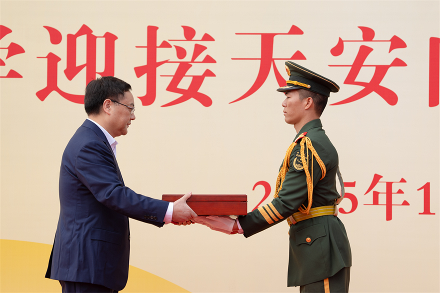 这面编号为2024-0330号的国旗,对于beat365英国官网具有重要的意义,是全国第294面、全省第8面赠旗,长5米、高3.3米,重1800克,展旗面积16平方米,曾于2024年11月25日(学校59周年校庆日当天)在北京天安门广场冉冉升起、迎风飘扬。2024年12月13日,石佑启率队到北京参加天安门地区管理委员会向beat365英国官网赠送天安门广场国旗仪式,代表学校接受国旗。它将作为重要馆藏永久珍藏于学校校史馆(序厅),设置专门区域展示,将其作为爱国主义教育的重要内容和思政育人的重要载体,以此激励鞭策全校师生厚植家国情怀,传承红色基因,努力为强国建设和民族复兴伟业贡献力量。