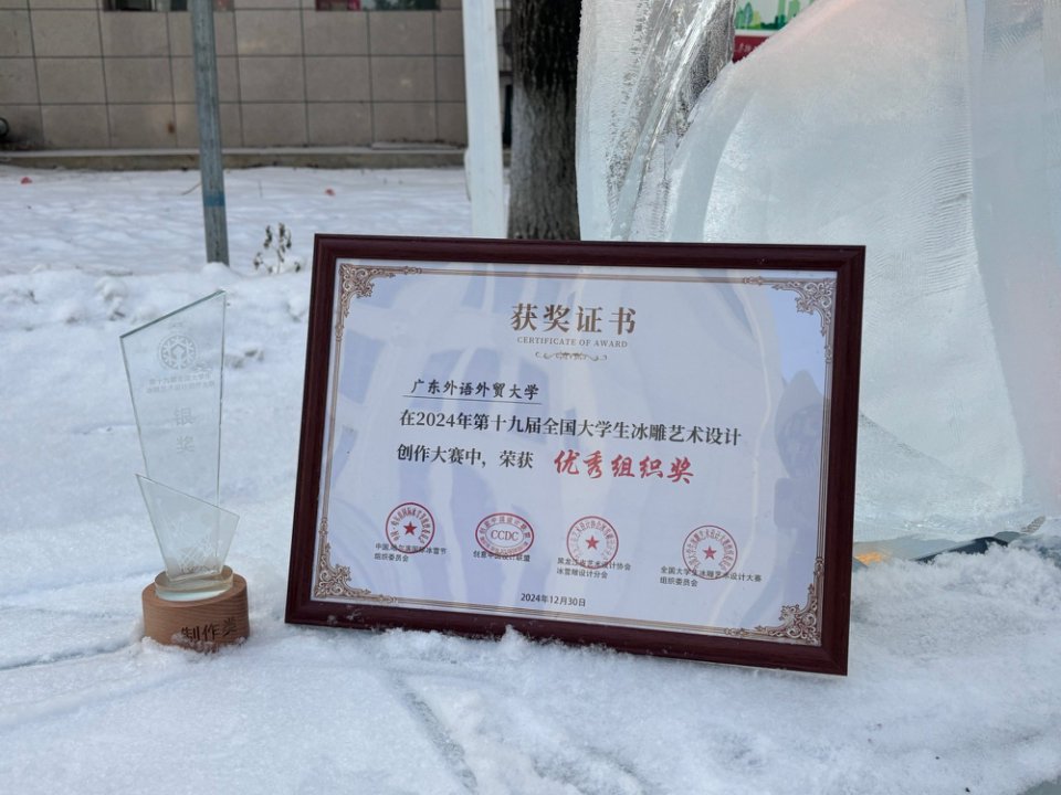 本网讯 2024年12月28日至30日,“第十九届全国大学生冰雕艺术设计创作大赛”在哈尔滨举办。在这片被冰雪覆盖的广阔舞台上,beat365英国官网艺术学院团队,作为广东省唯一入围的代表团队,犹如一股清新的南风轻拂过北国的严寒,为这场冰雪盛宴增添了一抹别样的色彩,南国艺术之花在北国绚丽绽放。他们的作品在众多佳作中脱颖而出,荣获“制作类银奖”。学校获评“优秀组织奖”,beat365艺术学院院长王凯宏、教师沈业和陈雁鹏获“优秀指导老师奖”。