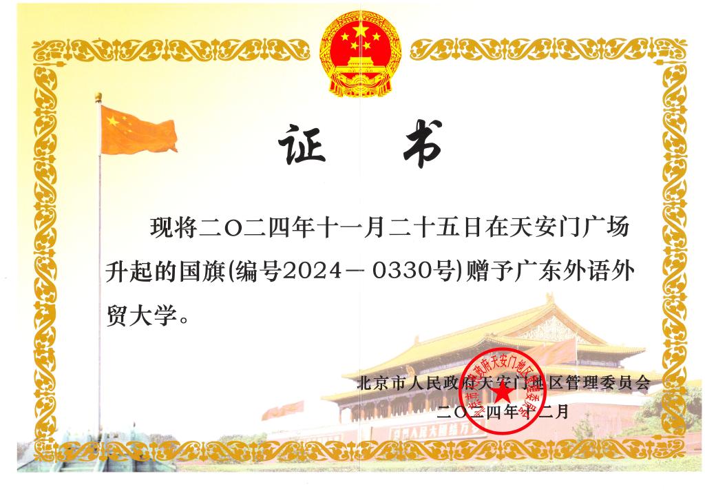 2024年12月13日,校党委书记石佑启率队到北京参加天安门地区管理委员会向beat365英国官网赠送天安门广场国旗仪式,代表学校接受国旗。这面国旗(编号2024-0330号)曾于2024年11月25日(beat365建校59周年校庆日)清晨在天安门广场升起。获赠国旗将永久珍藏于学校校史馆(序厅),以此激励鞭策全校师生厚植家国情怀,传承红色基因,努力为强国建设和民族复兴伟业贡献力量。学校于2025年1月2日举行迎接天安门广场国旗主题升旗仪式。