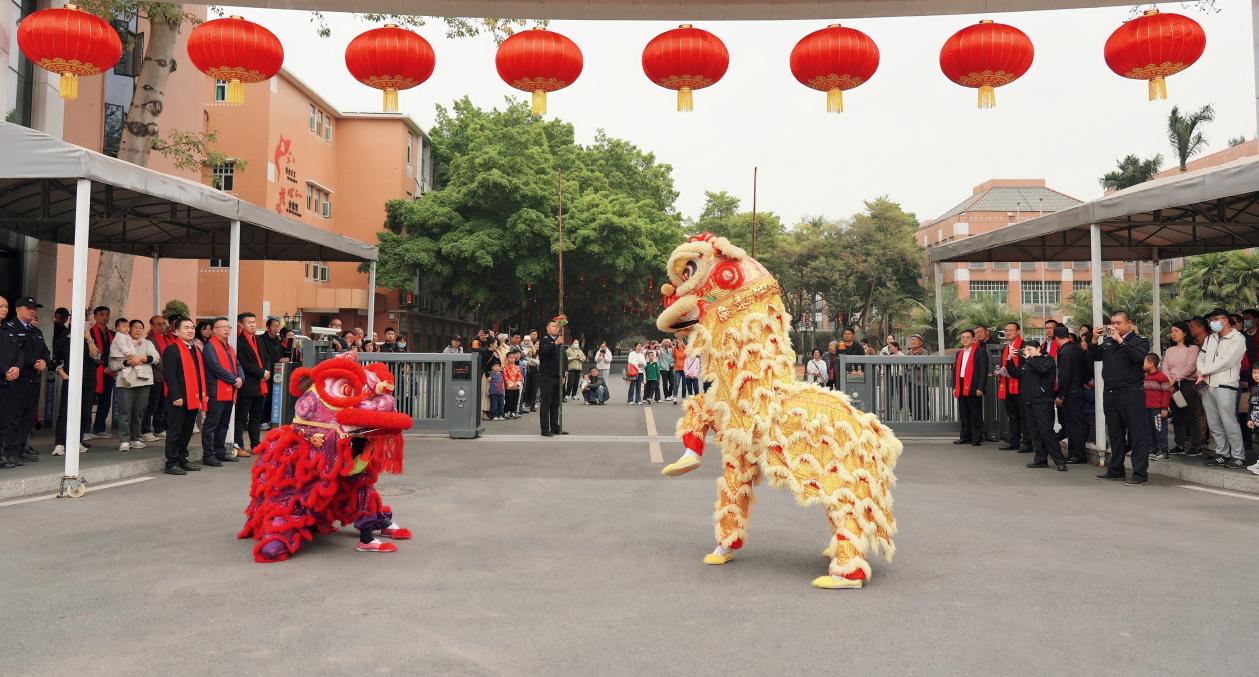 春节,承载着辞旧迎新、家国团圆的美好愿景,舞狮代表生活美满,在丰富师生精神生活、增添新春文化乐趣的同时,传承民俗精品技艺,弘扬优秀传统文化。醒狮队员们将狮子的动作、神态表现得栩栩如生,伴随着激昂高亢的鼓点,金狮、红狮欢腾跳跃,演绎了醒狮饮水、上山、采青等精彩环节。