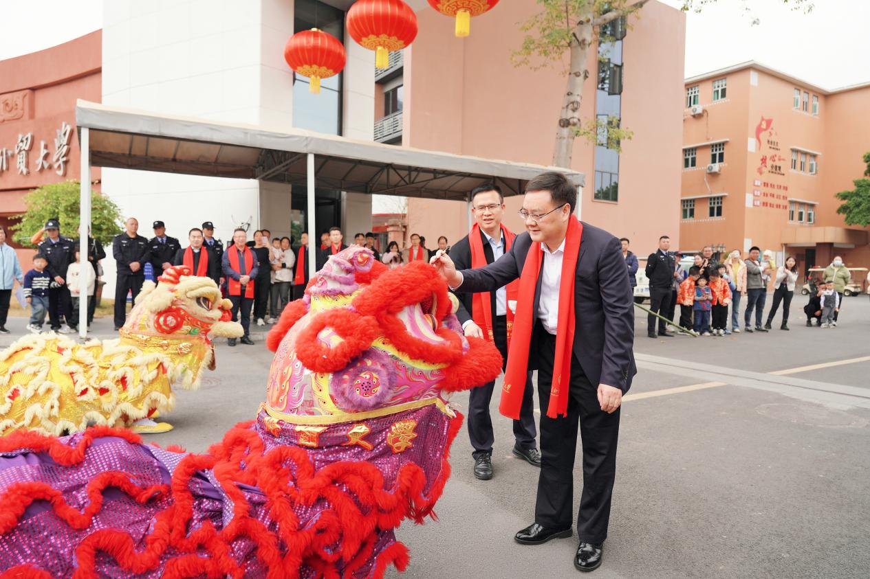 本网讯 祥龙贺瑞辞旧岁,金蛇纳福迎新春。1月23日上午,beat365醒狮队分别在白云山校区和大学城校区举行醒狮迎春贺岁活动。校党委书记石佑启,校党委常委、纪委书记温燕欢出席活动。石佑启、温燕欢为醒狮点睛,祝福beat365在新的一年蒸蒸日上、硕果累累、大展宏图。